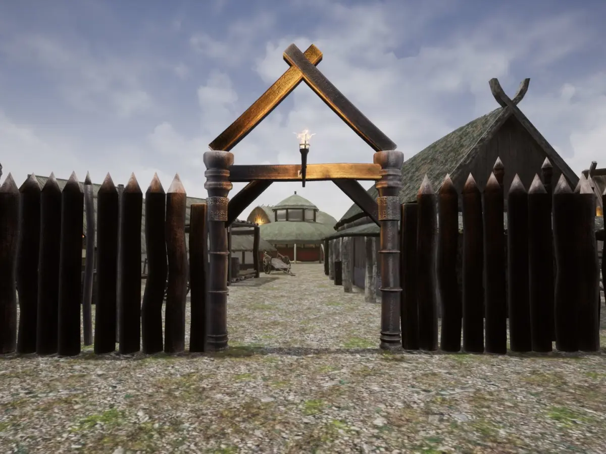 Collection of 52 Viking village props, including: houses, barns, shacks, shields, haywagons, fence and others.