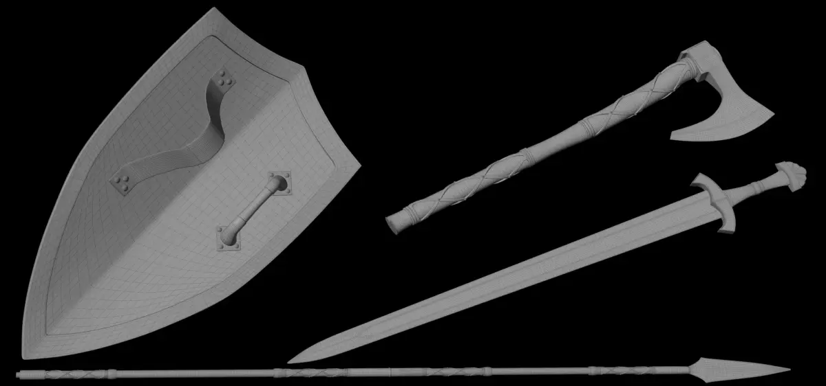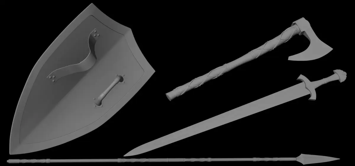 This model contains Viking weapons (Spear, Sword, Axe and Shield)