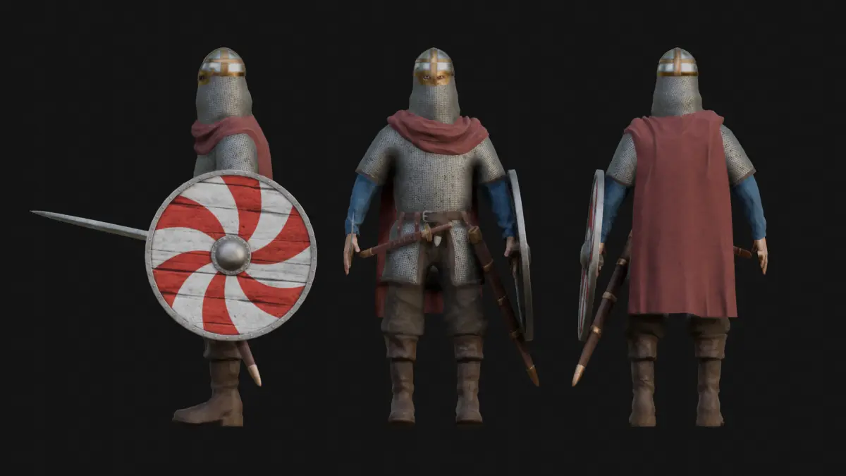 6 materials in total. Separate materials for weapons, human skin, hair/beard, clothing1, clothing2 and clothing3.