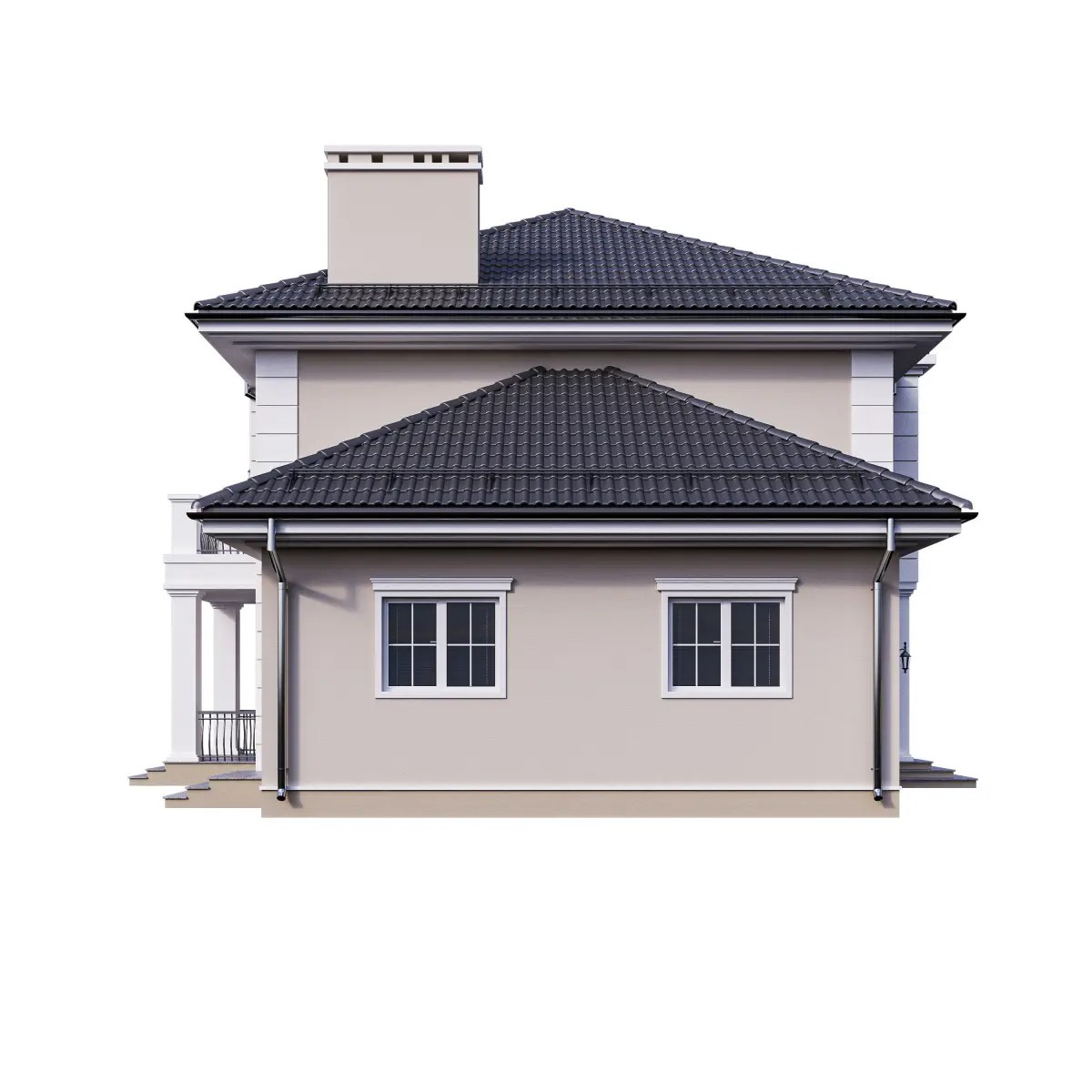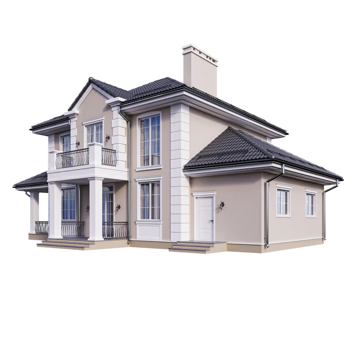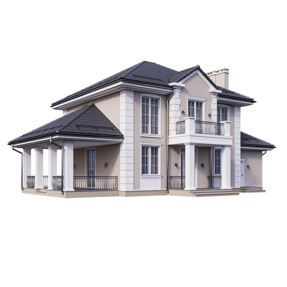 Photorealistic high detiled 3d model of contemporary classic home. Model does't include interior, just curtains and blinds in front of windows.