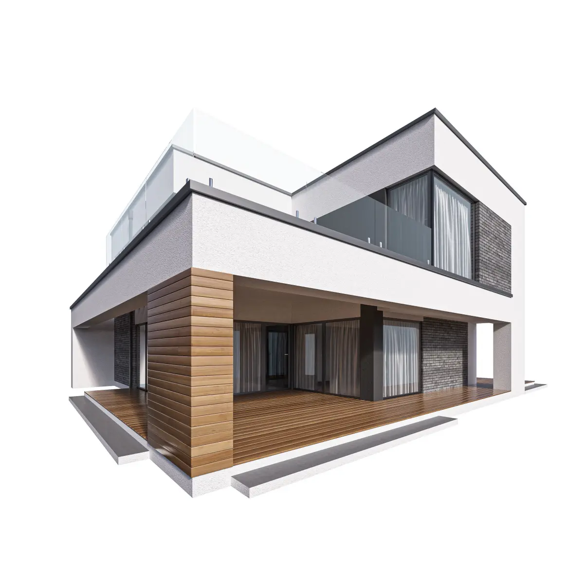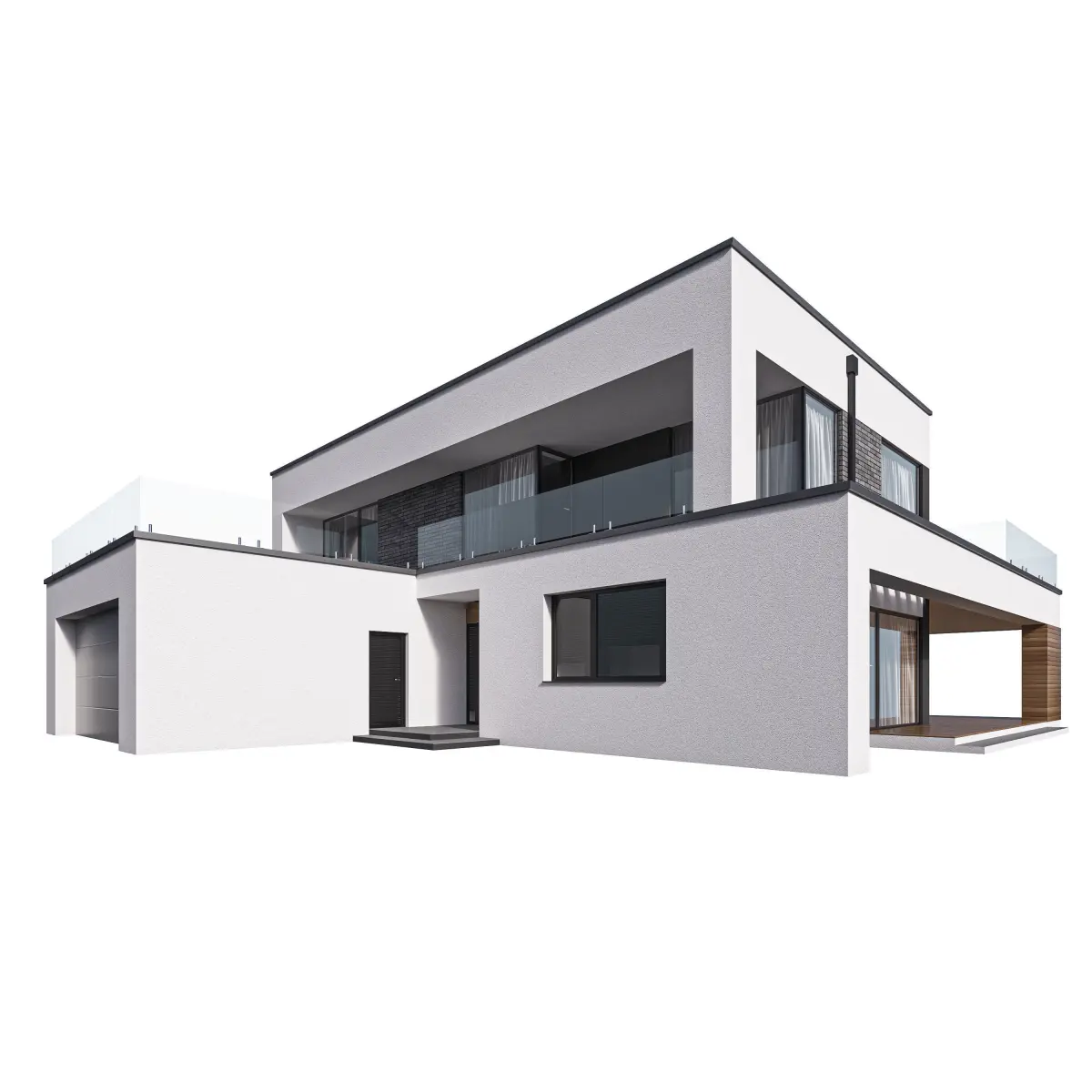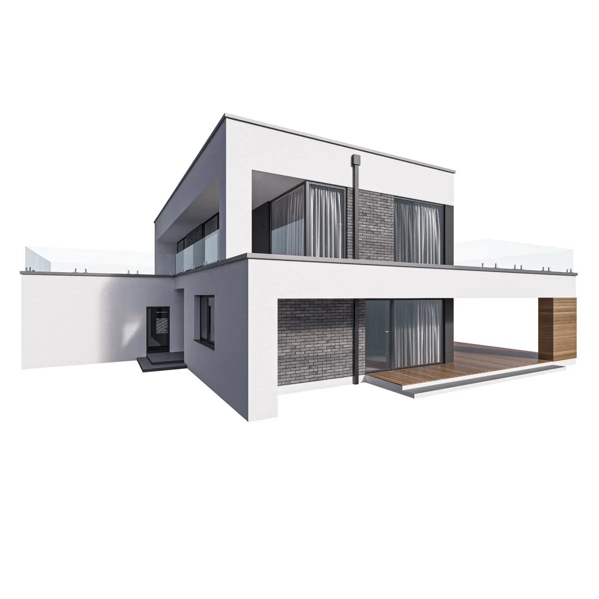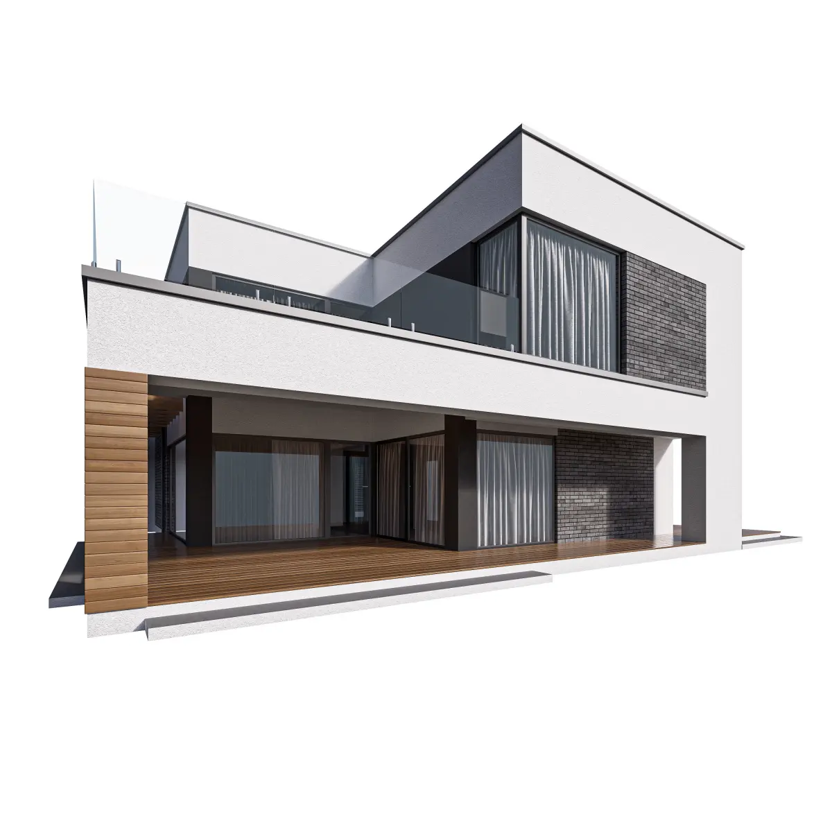 Photorealistic high detiled 3d model of contemporary home. Model does't include interior, just curtains and blinds in front of windows.
