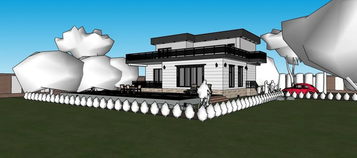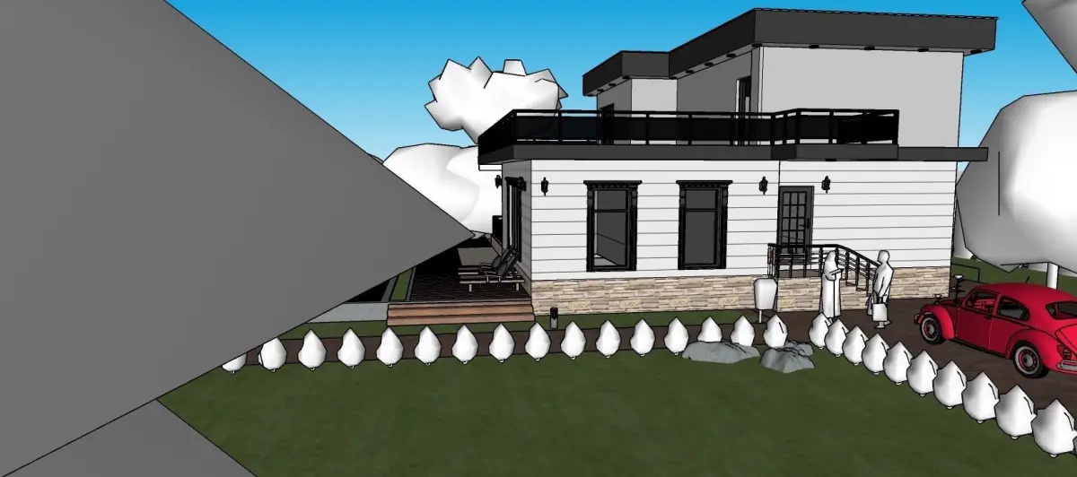 villa modern house with car on lawn Low-poly 3D model