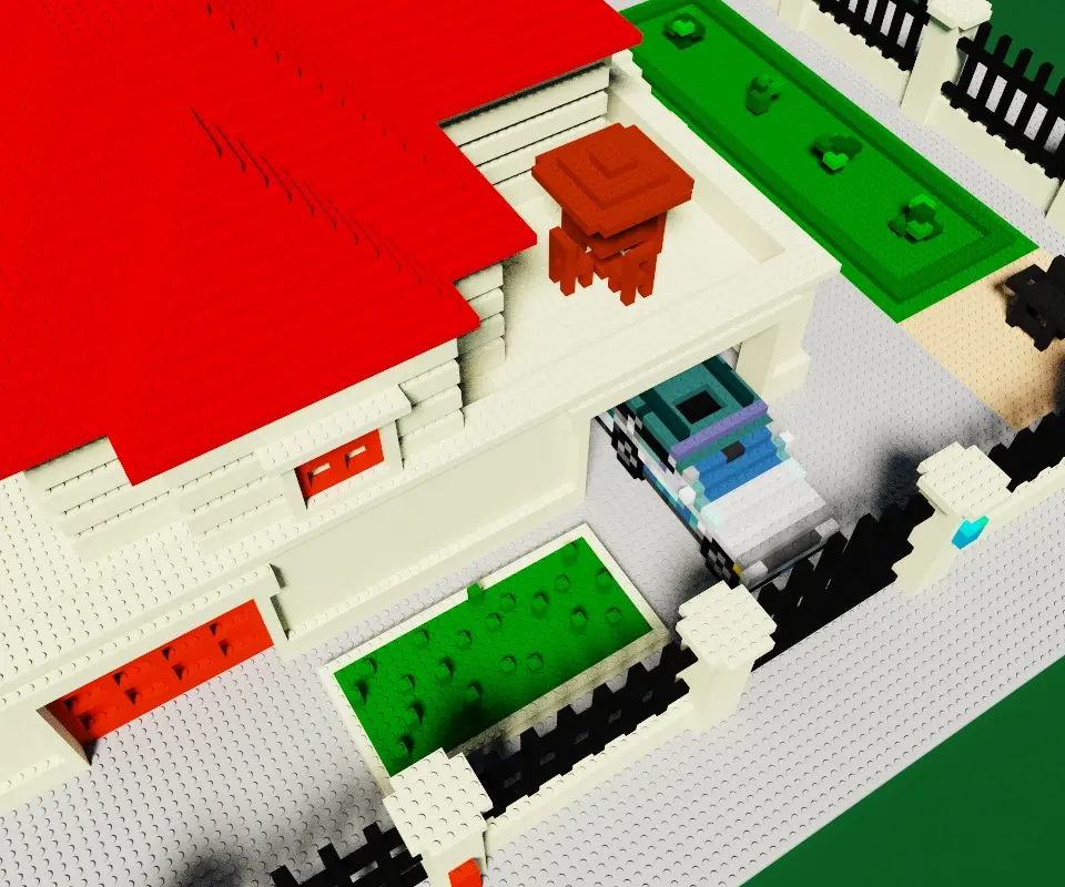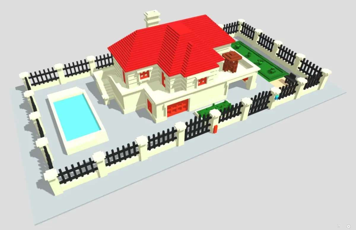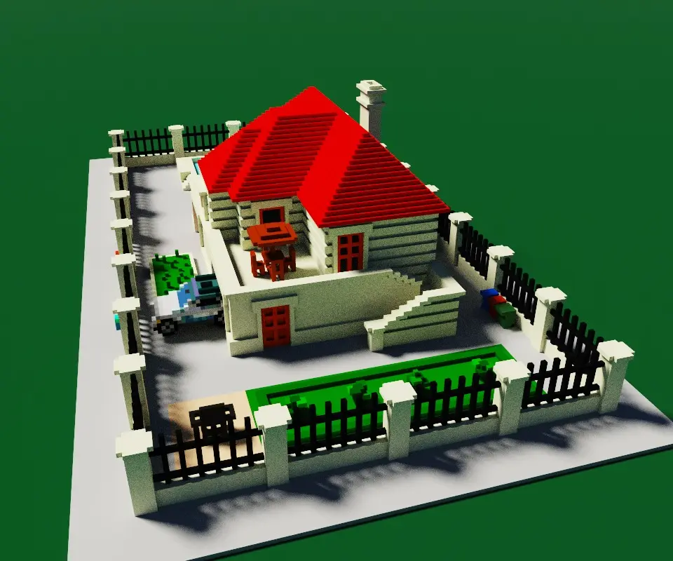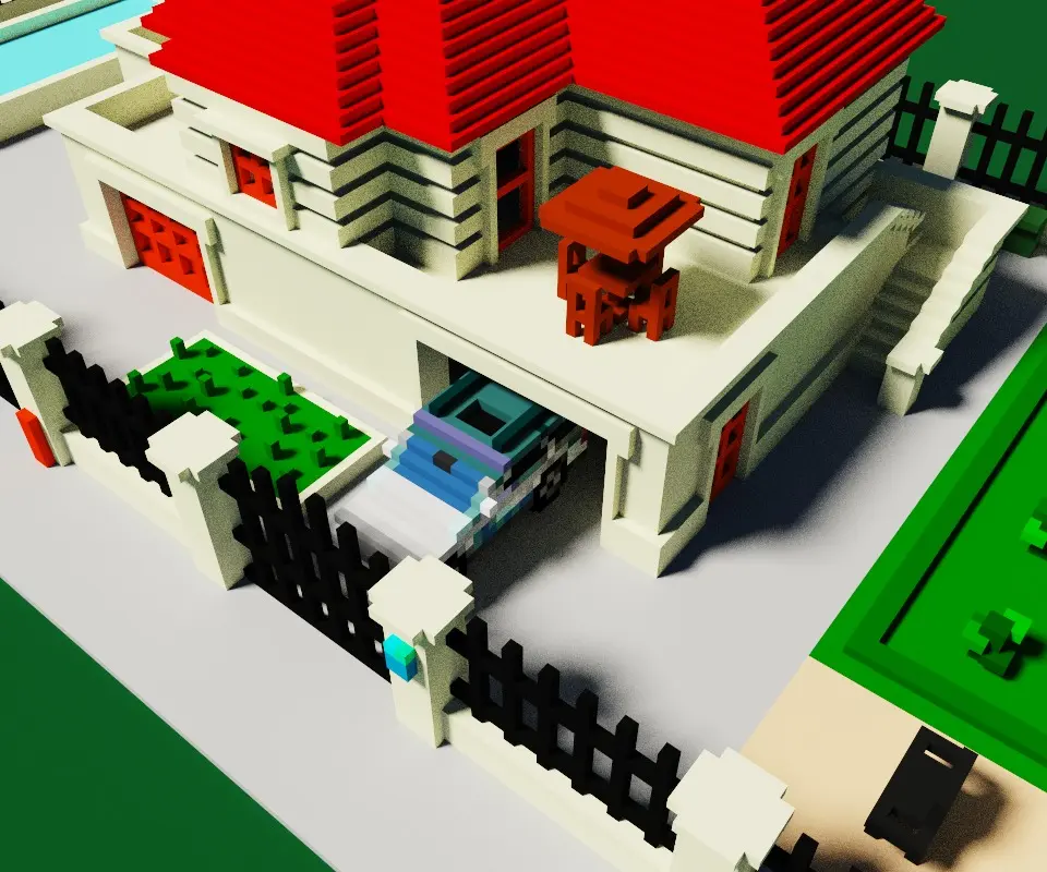 This 3D model showcases a stunning voxel-style villa, meticulously crafted with attention to detail. The villa boasts a unique architectural style with a blend of modern and traditional elements.