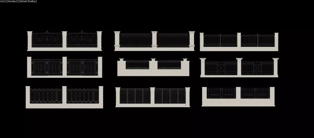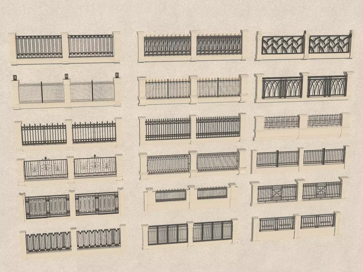This is a set of design proposals for villa boundary walls and wrought iron guardrails in an European light luxury style, featuring an off-white stone base paired with black metal grilles as the core visual elements. The guardrails incorporate a variety of exquisite details such as geometric lines, plant textures and spire decorations, retaining the elegant texture of classical architecture while boasting the neat temperament of modern minimalism.Ideal for the renovation of boundary walls of single-family villas and high-end courtyards, it can enhance the overall aesthetic appeal and quality of the building's facade, while ensuring residential safety and privacy.