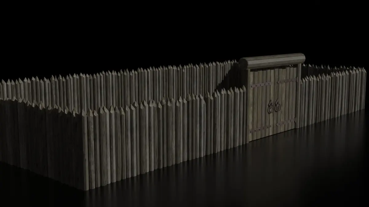 A fence made of planks with angular turns and a gate.