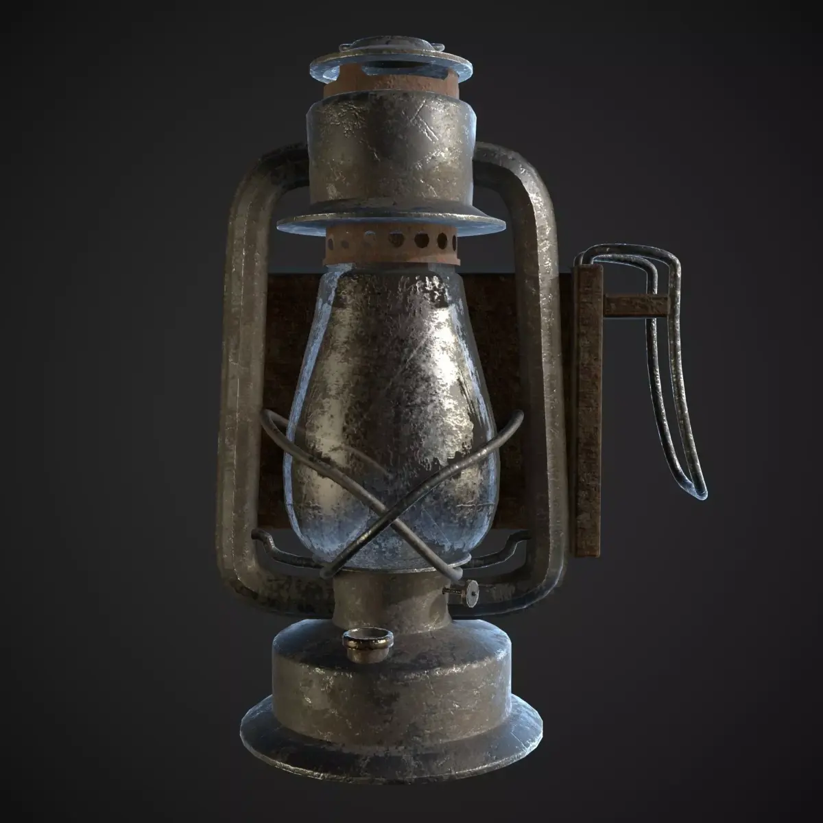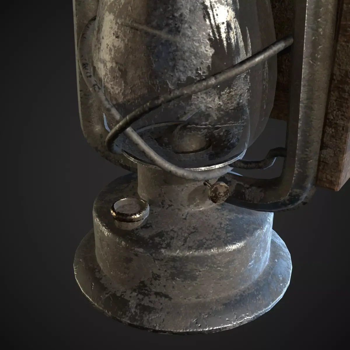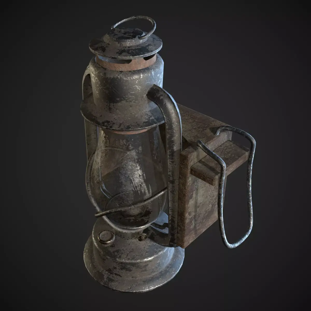 Model of an old village kerosene lantern with a hook for hanging on the side of a cart.