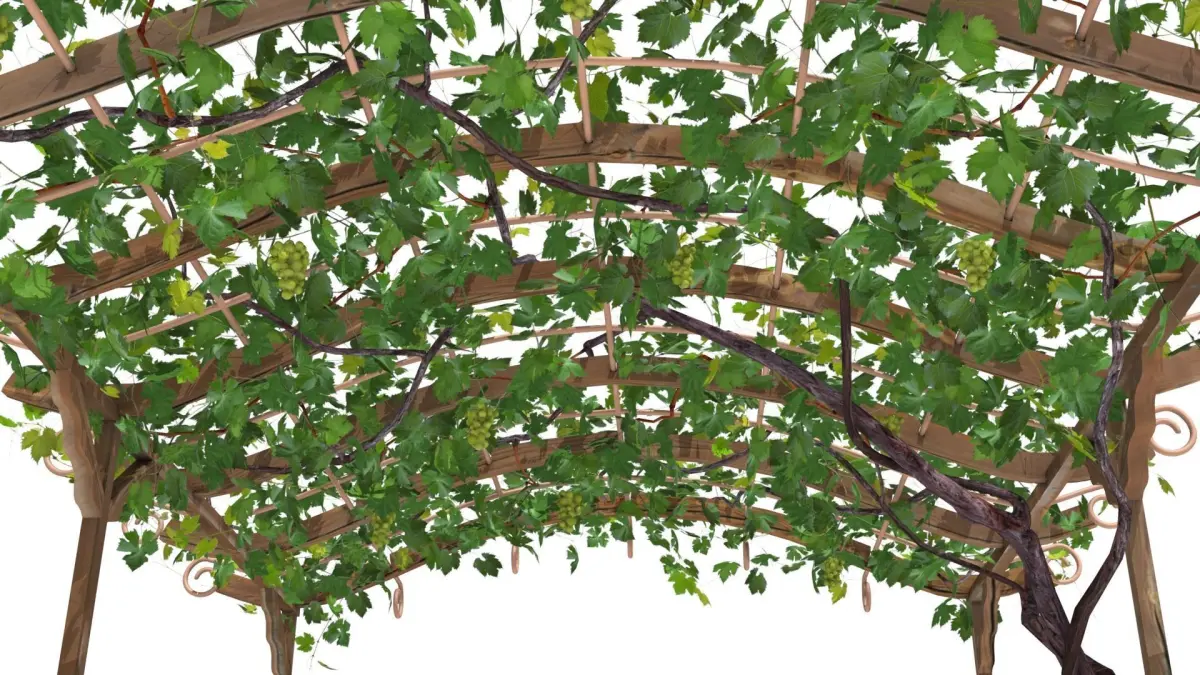 High poly vine arbor, leafs are created with opacity map, grapes, tree and pergola are mesh.