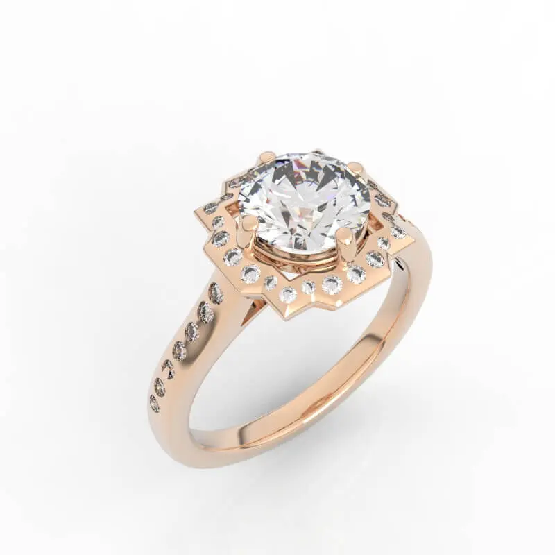 At the heart of this model lies a brilliant 1-carat round diamond (approximately 6.5mm), embraced by a dazzling polygonal halo reminiscent of vintage starbursts. Surrounding the center stone are 38 meticulously placed accent diamonds, layered in a luxurious multi-dimensional structure. Every angle radiates brilliance, with a finely pavé-set band completing the design.
