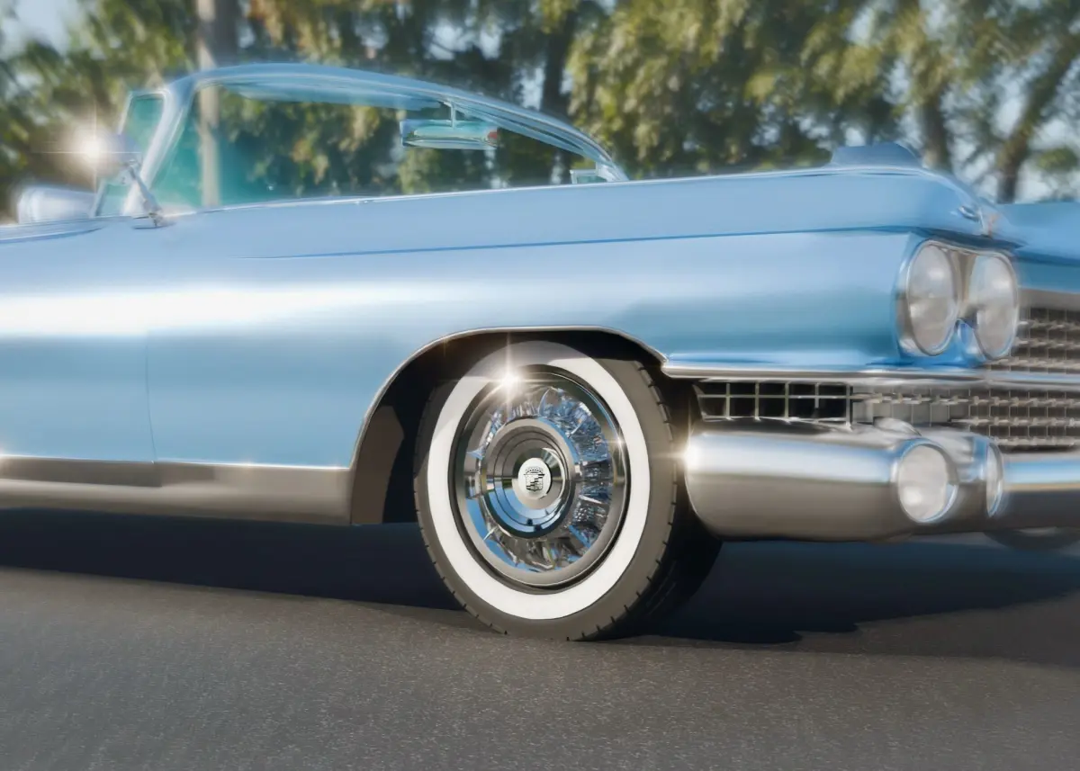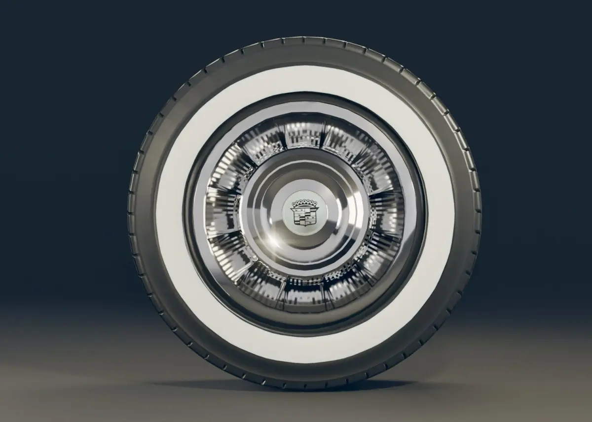 3D model replica of a vintage Cadillac Eldorado hubcap and whitewall tire featured from 1959 to 1960. The simple yet detailed mesh captures the timeless elegance and beauty of the classic Cadillac Eldorado in this design.