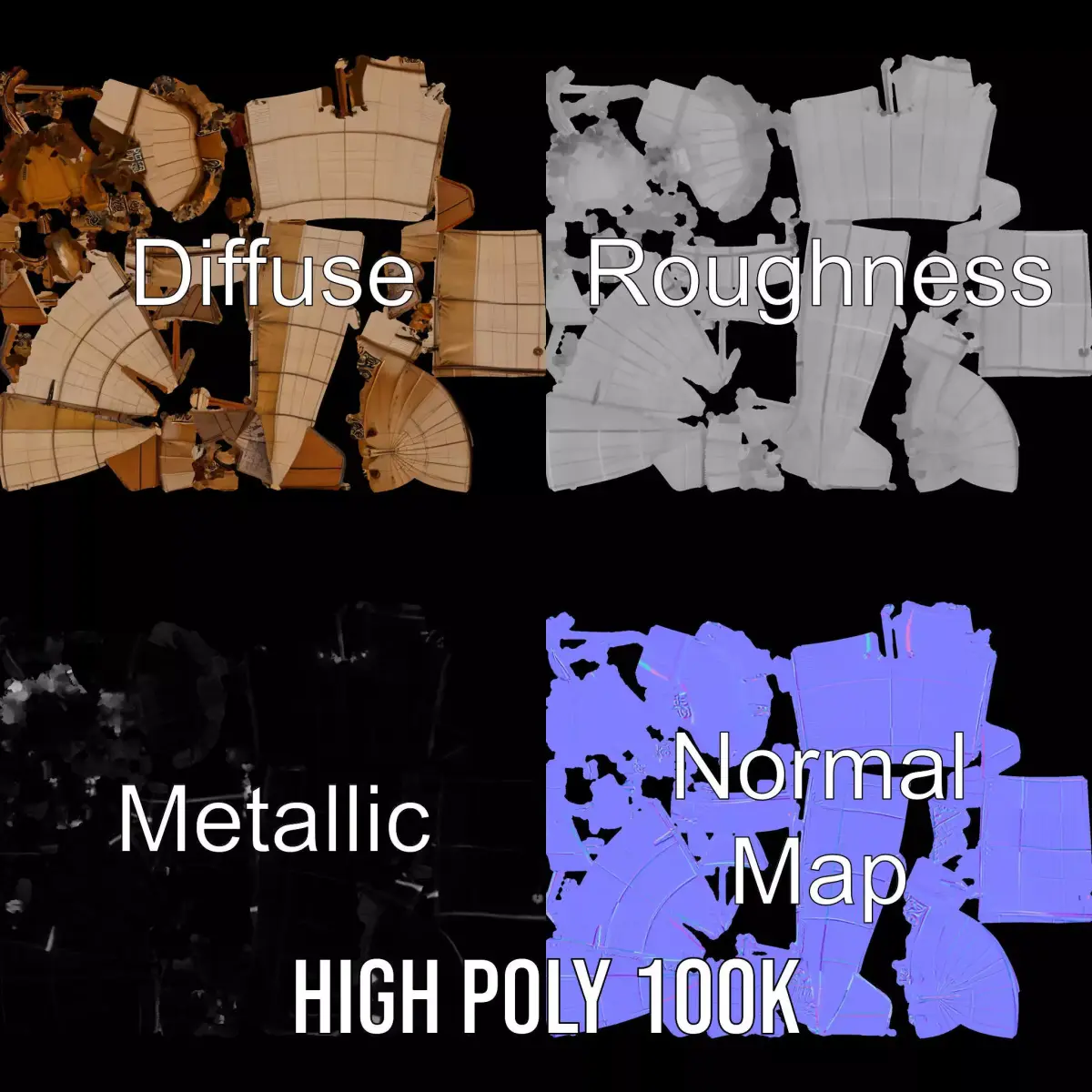 This airship is perfect for steampunk themes, historical flight simulations, or creative storytelling scenes. The model's textures are PBR, Diffuse, NormalMap, and reflection/roughness/metallic, which are suitable for any modern rendering engine. All models are accurately unwrapped and have no overlapping UV.