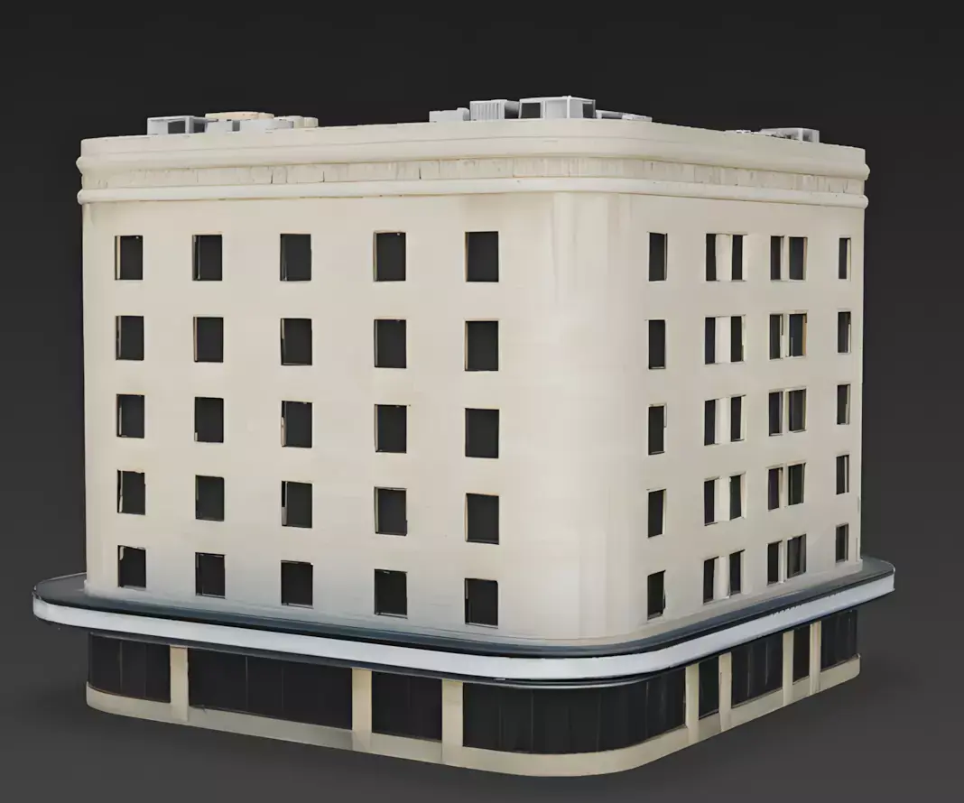 The Overall Concept This asset is a mid-sized commercial building designed in the Streamline Moderne style (a later version of Art Deco). It resembles a classic 1940s or 50s department store, city hall, or library found in a bustling downtown district.