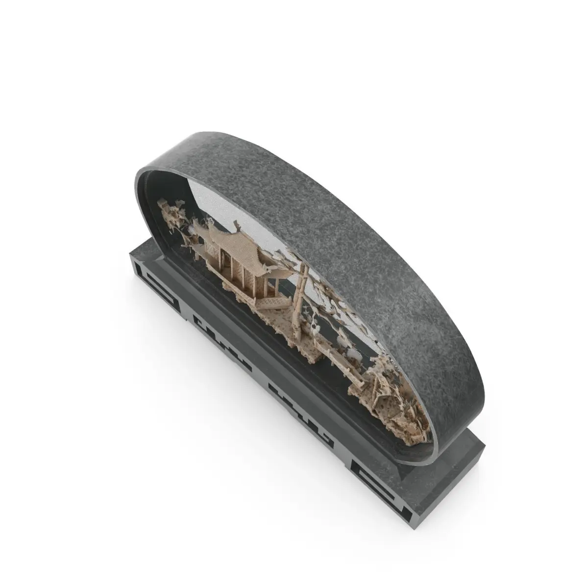 Vintage Asian / Chinese / Oriental round carved Cork Diorama Glass Shadow Box with Cranes. Intricately detailed carving of a pagoda with trees, a bridge and 2 cranes. Intricate 3D landscape design in decorative stand.