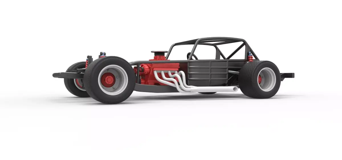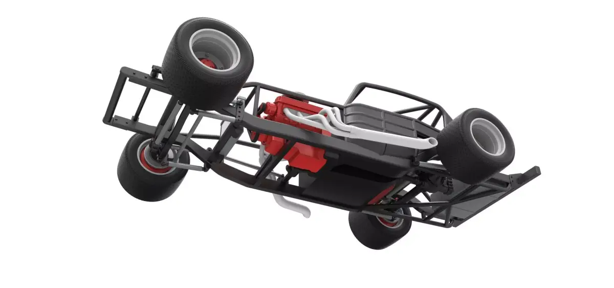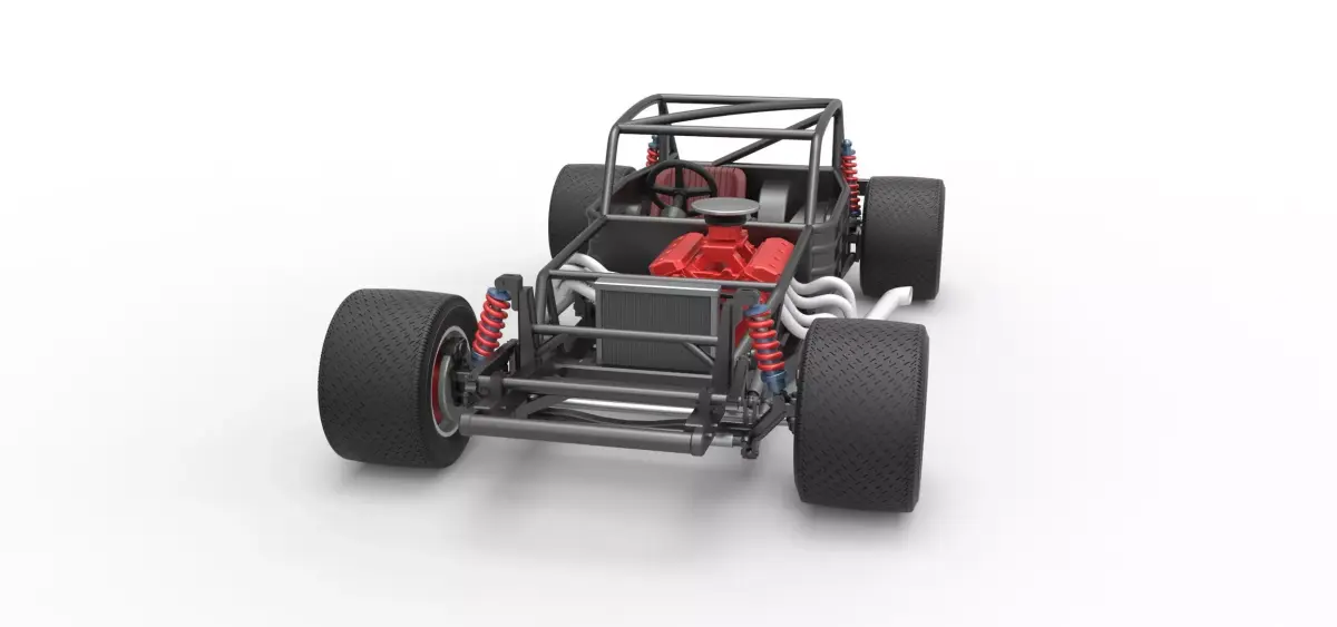 The model consists of parts: Air filter cap, Air filter, Engine, Frame, Front radiator, Front wheel hubs, Left exhaust, Rear wheel hubs, Right exhaust, Rims, Seat, Shifter, Steering wheel, Tank, Tires.