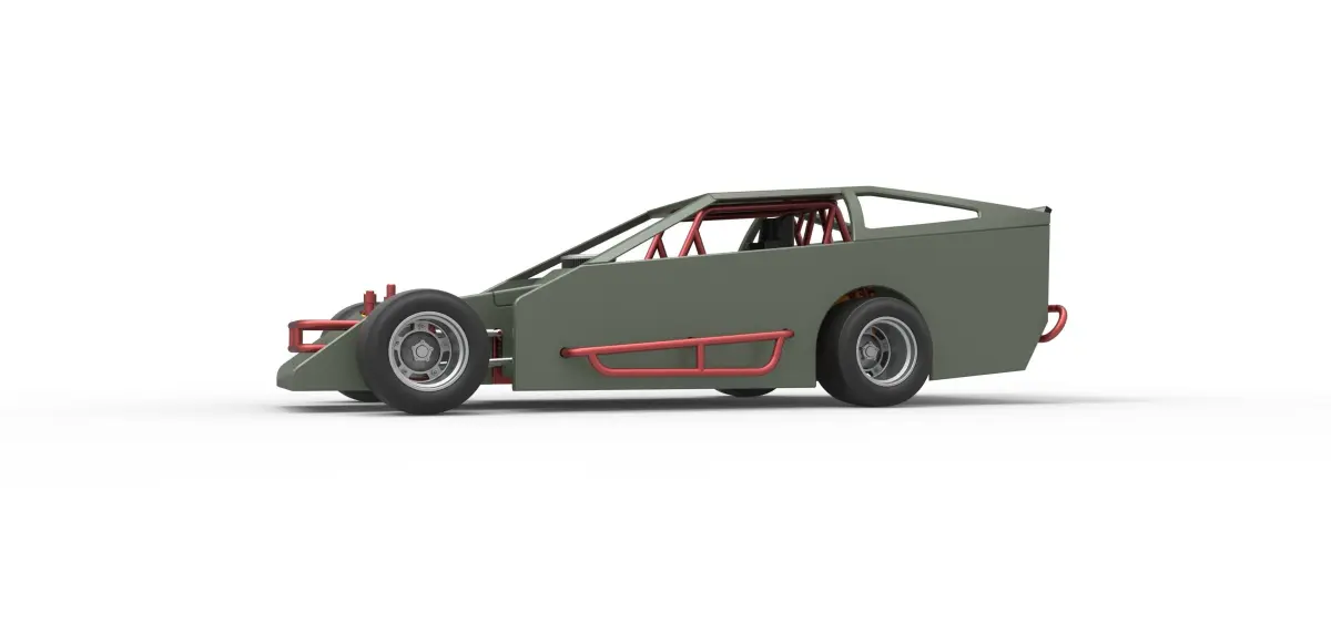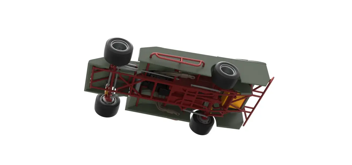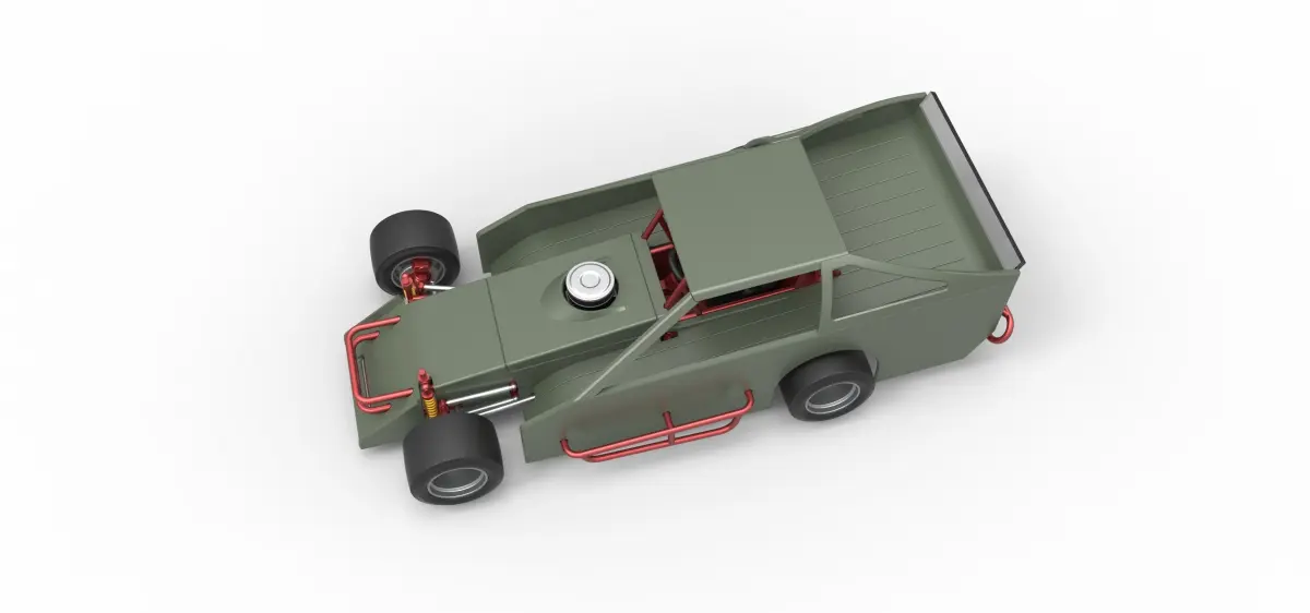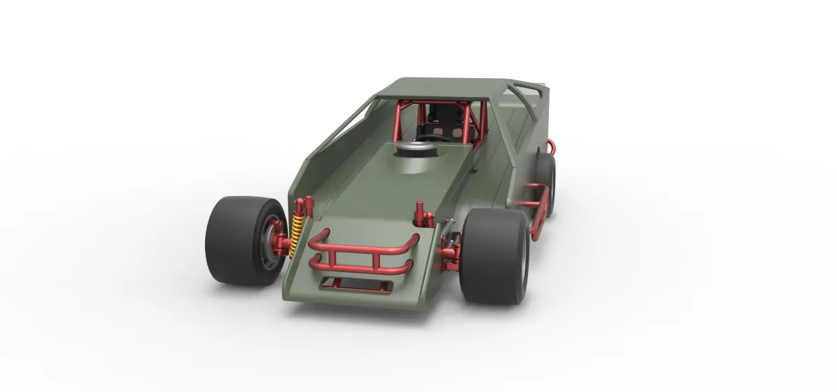 The model consists of parts: Air filter cap, Air filter, Body, Engine, Front bumper, Left exhaust pipes, Radiator, Right exhaust pipes, Rims, Seat, Shell left part, Shell main part, Shell right part 1,2, Shifter, Spoiler, Steering wheel, Tank, Tires.