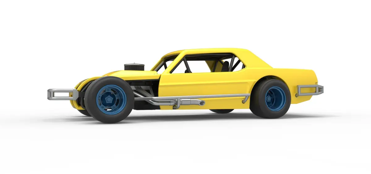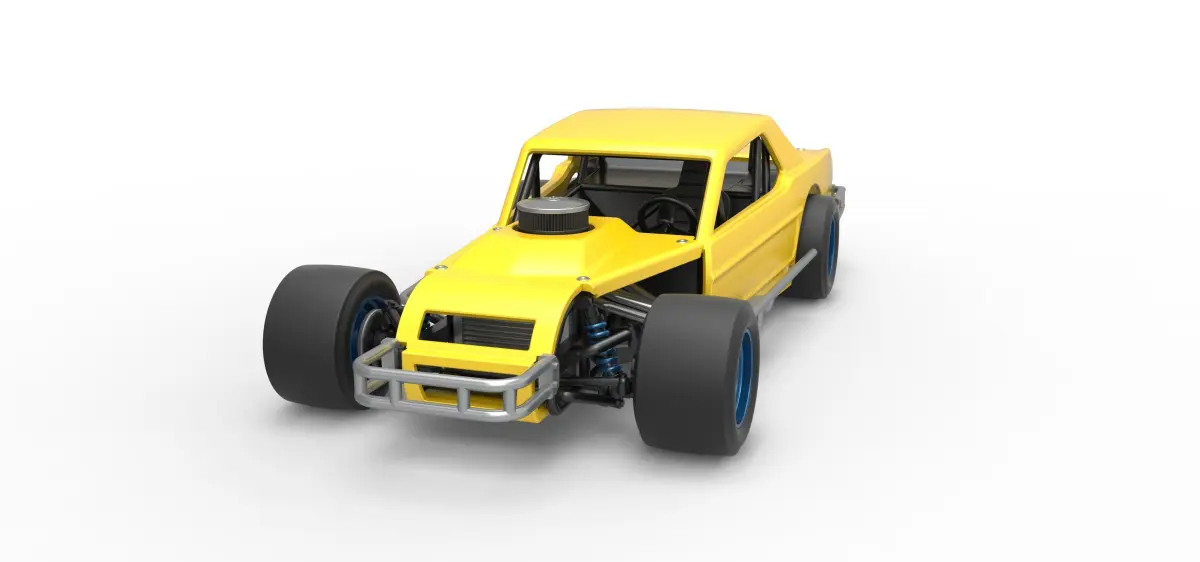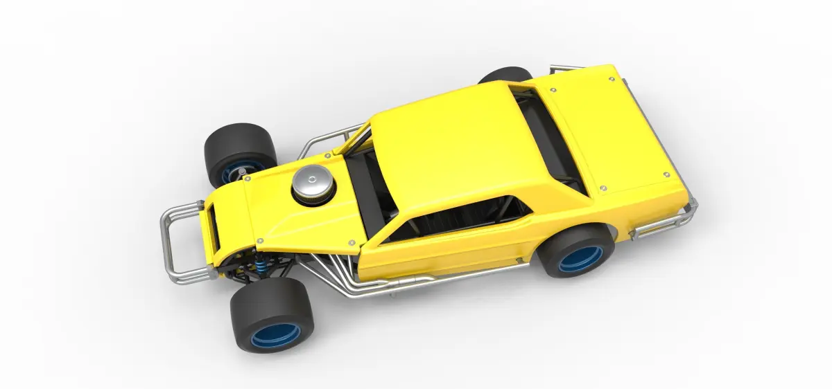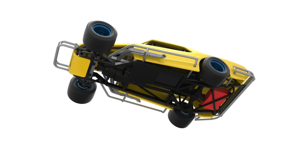 The model consists of parts: Air filter cap, Air filter, Engine, Frame, Front bumper, Hood, Left bumper, Left exhaust, Left rear bumper, Nose, Radiator, Right bumper, Right exhaust, Right rear bumper, Rims, Seat, Shell, Shifter, Steering wheel, Tank, Tires.