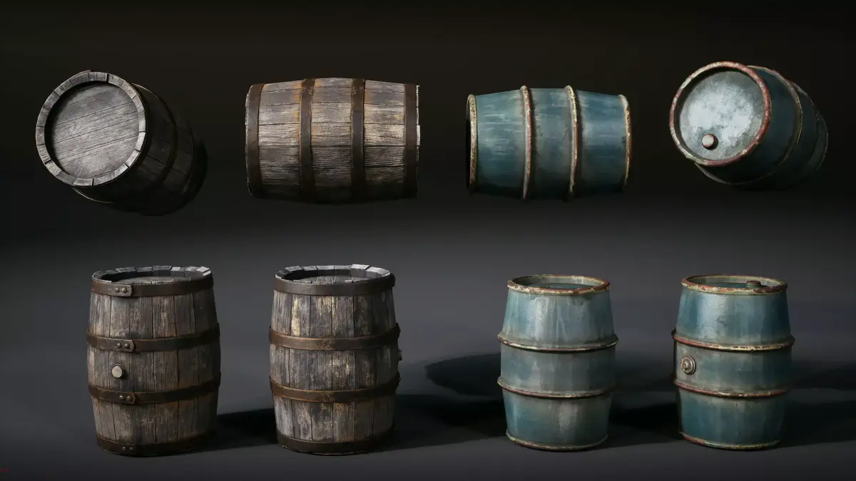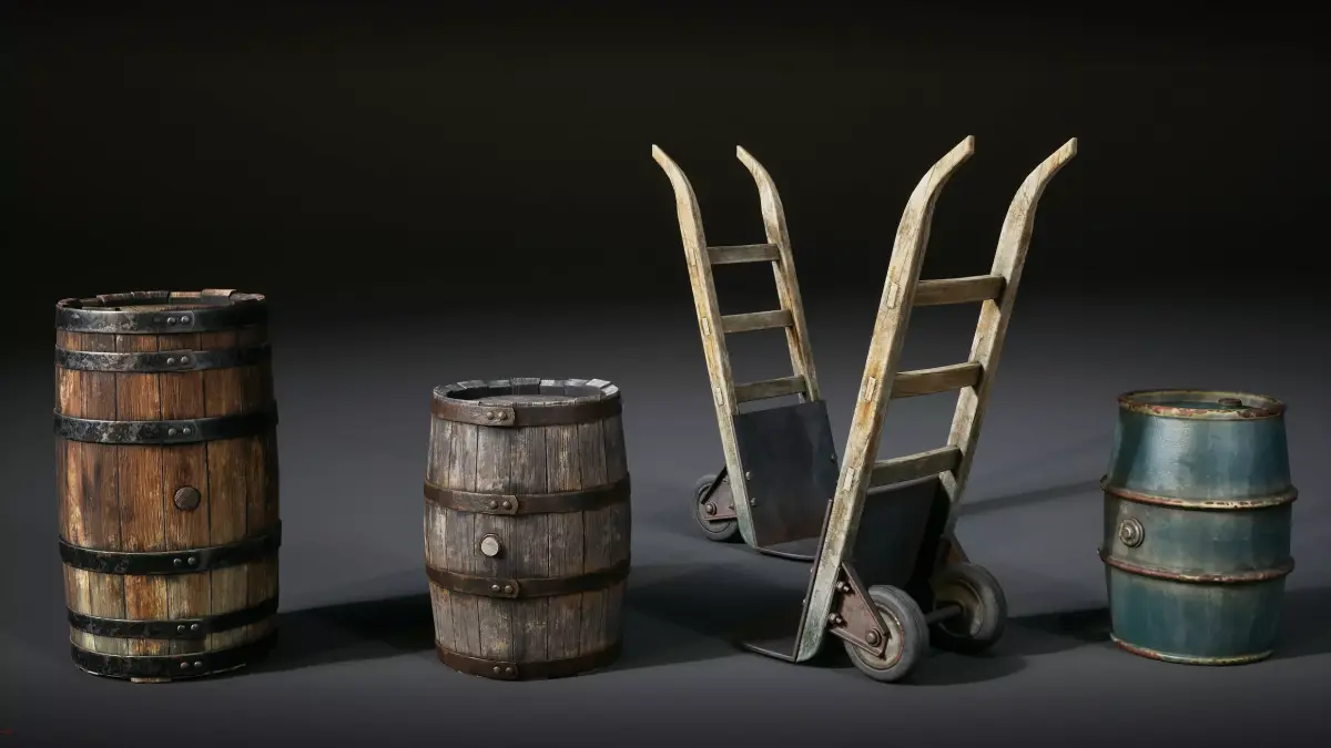 Low-poly geometry with unique baked details and two separate texture packs (barrels and crates).