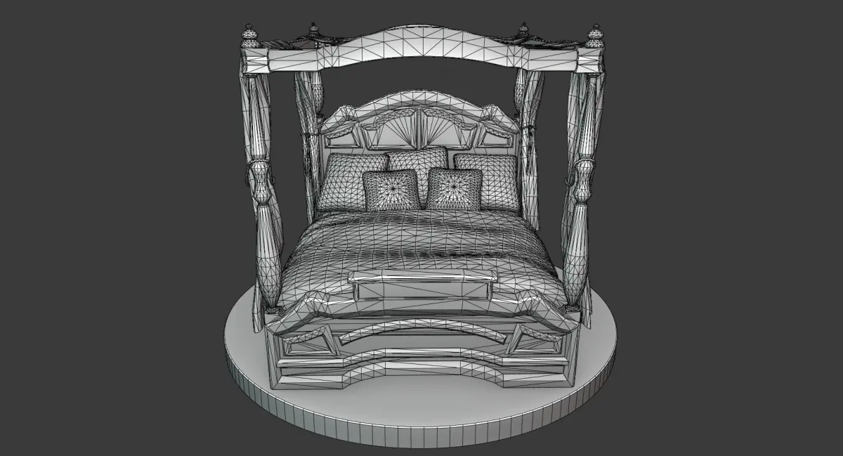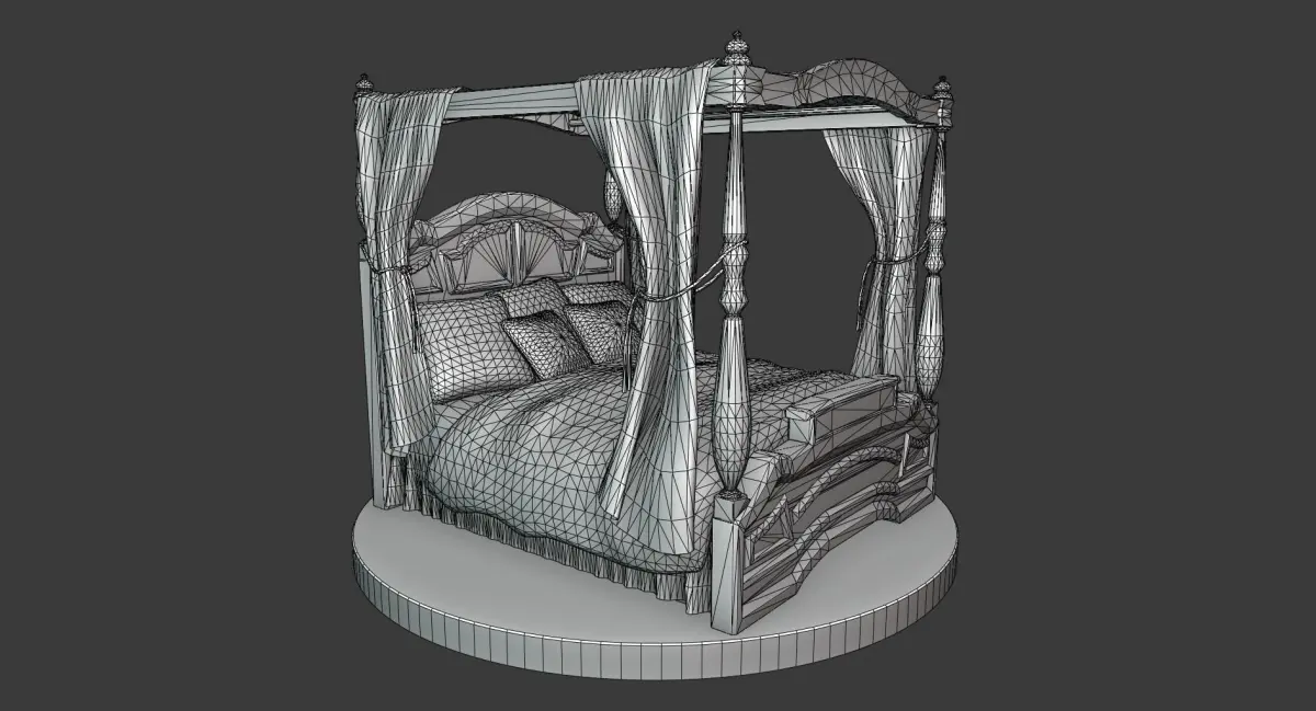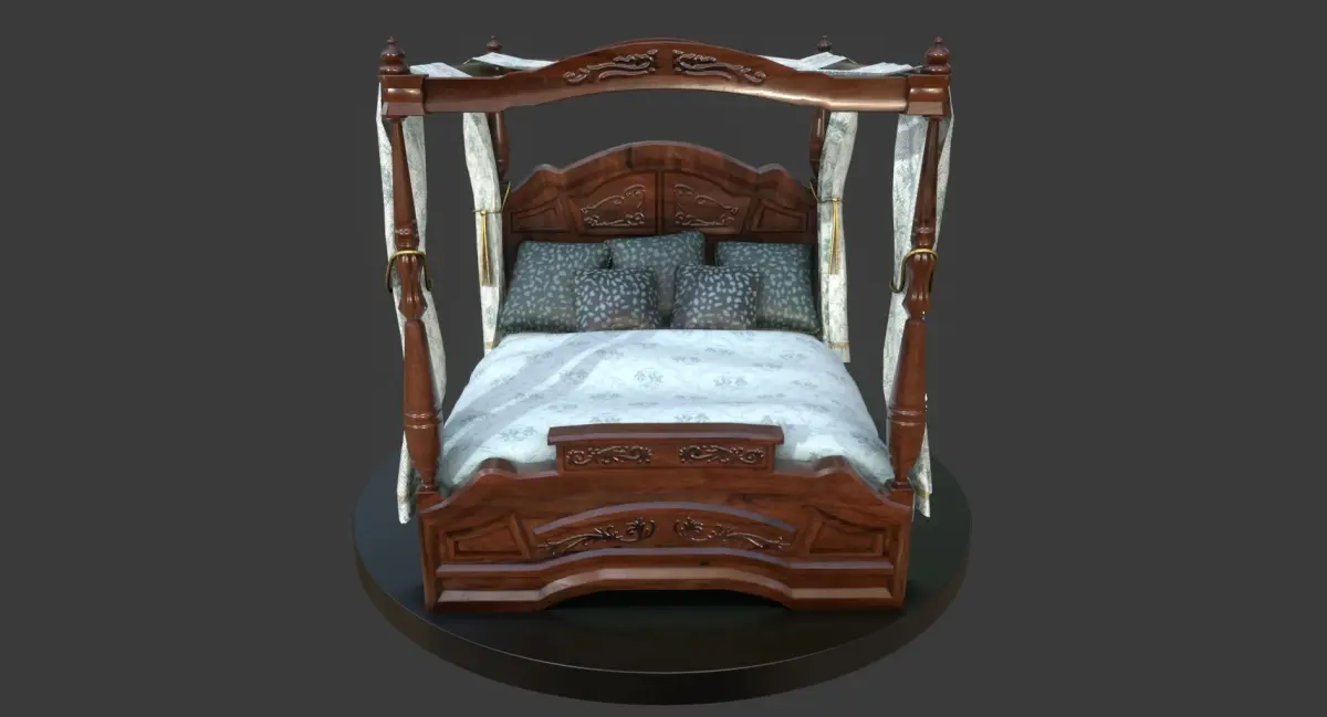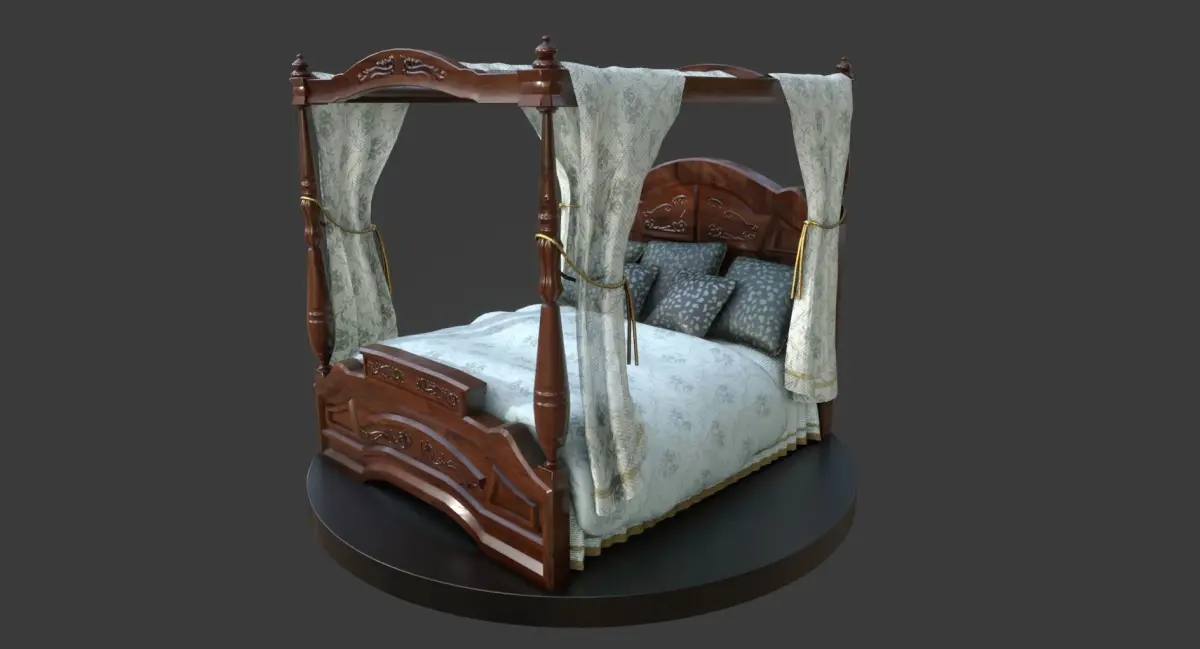 This is a model of a wooden, vintage-looking bed with cushions, curtains / canopy and some golden ornament details. It is a part of a larger set of similar furniture in this style.Features:
