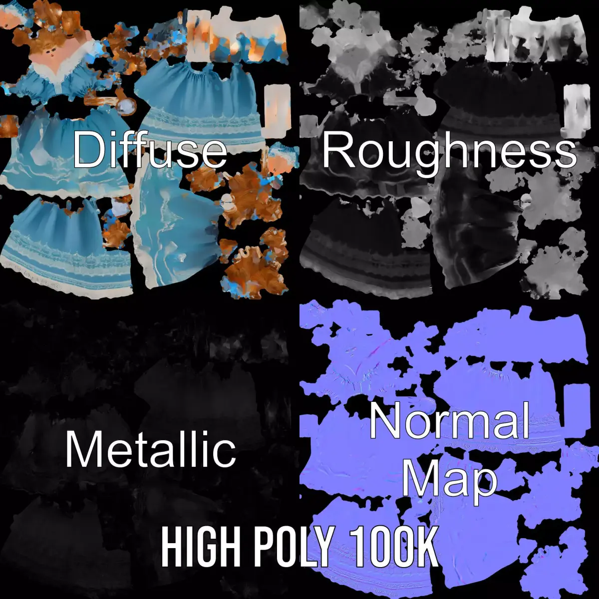 The Vintage Blue Doll model pack captures the charm and elegance of a classic porcelain doll dressed in a detailed blue gown with lace accents. Each model has 3 levels of detail: low-poly (1000 triangles for mobile), middle-poly (10,000 triangles for environment), and high-poly (100,000 triangles), which allows for the use of this model in production rendering (such as 3ds max, Maya, Cinema4d, Blender, Vray/Corona/Cycles and all others), game engines (Unity and Unreal compatible), and interactive presentations, providing a choice of detail based on the LOD System principle. Perfect for animation, interior decor visualization, or historical educational content, this model brings timeless craftsmanship to any project. The model's textures are PBR, Diffuse, NormalMap, and reflection/roughness/metallic, which are suitable for any modern rendering engine. All models are accurately unwrapped and have no overlapping UV. All textures are 4096*4096 in size. Please like and leave a comment for the model if you enjoyed it.