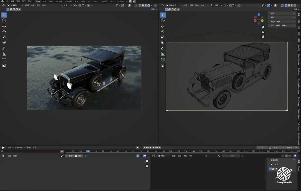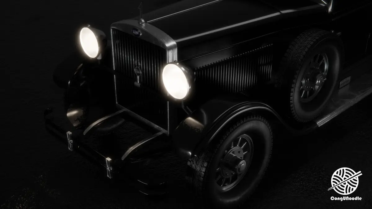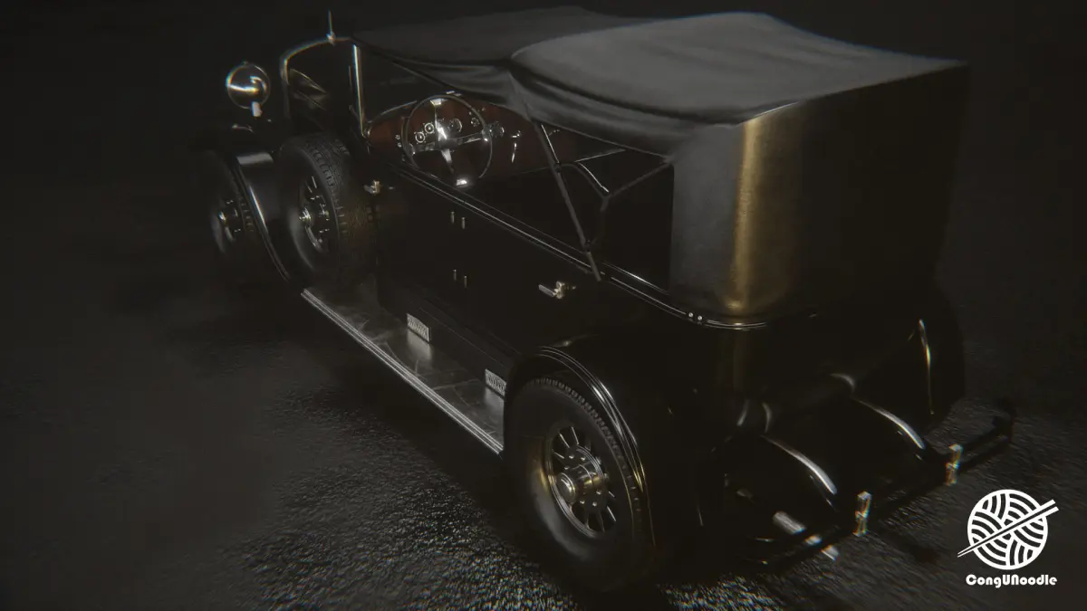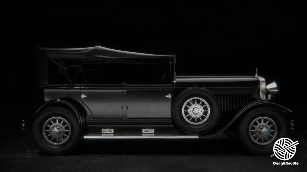 This is a 3D rendering of a classic vintage car with an extremely retro style and excellent texture. The overall visual presentation is very high-end, giving people a cinematic visual atmosphere This car is clearly influenced by the design of luxury sedans in the 1920s and 1930s The upright radiator grille, with metal trim, exudes a sense of age The classic circular headlights, with a faint yellowish glow, enhance the retro feel There was an external spare tire on each side of the vehicle body, which was a typical configuration of high-end models at that time It is a soft canopy design with excellent detail handling. For instance, it features a leather texture with wrinkles and variations in light effects
