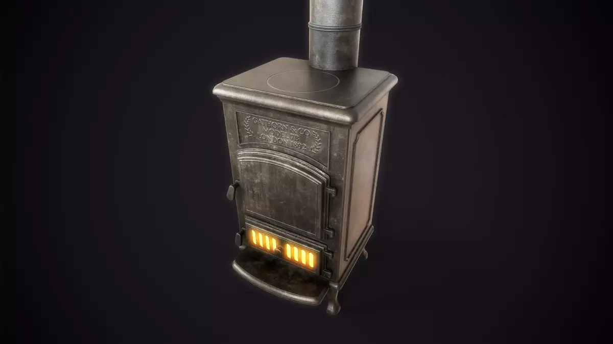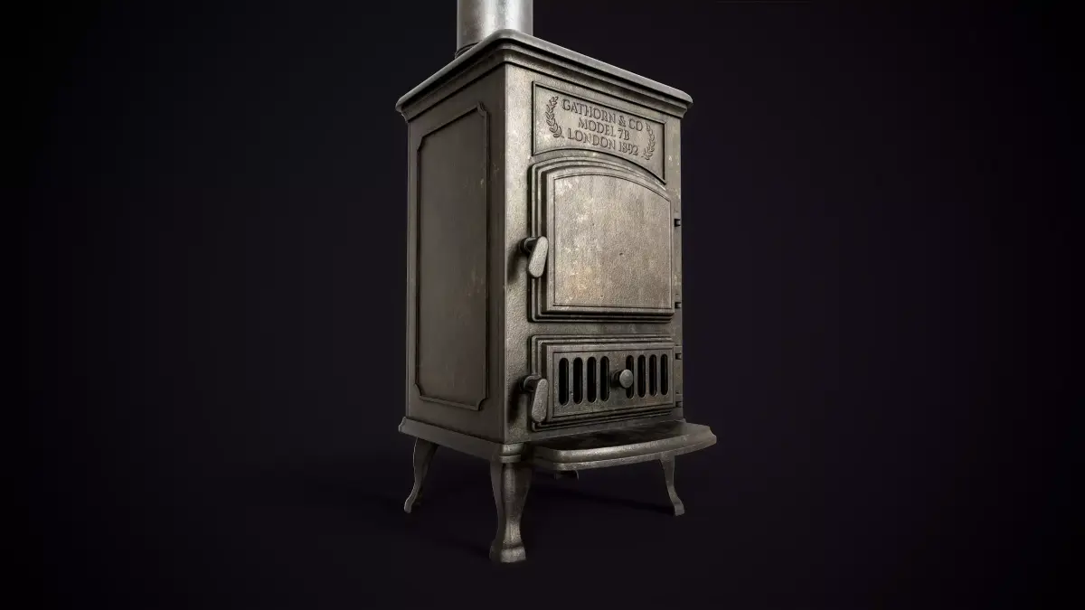 3D model of a late 19th-century cast iron stove. Features a simple, classic design with realistic signs of age and use.