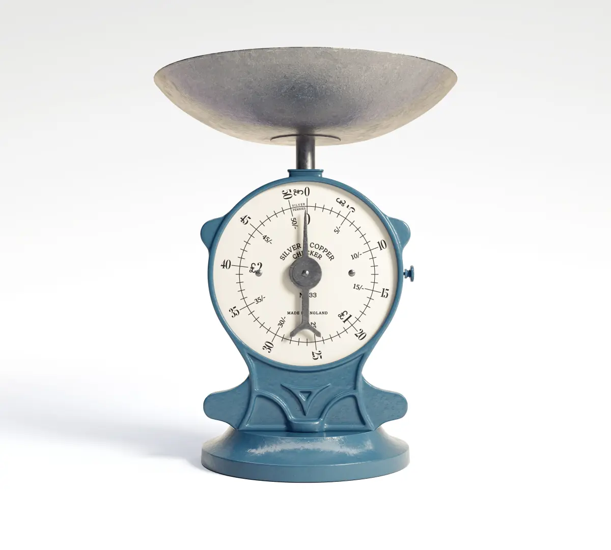 An vintage cast iron weighing scale used for measuring coins. Created natively in Cinema 4d and rendered with Redshift.