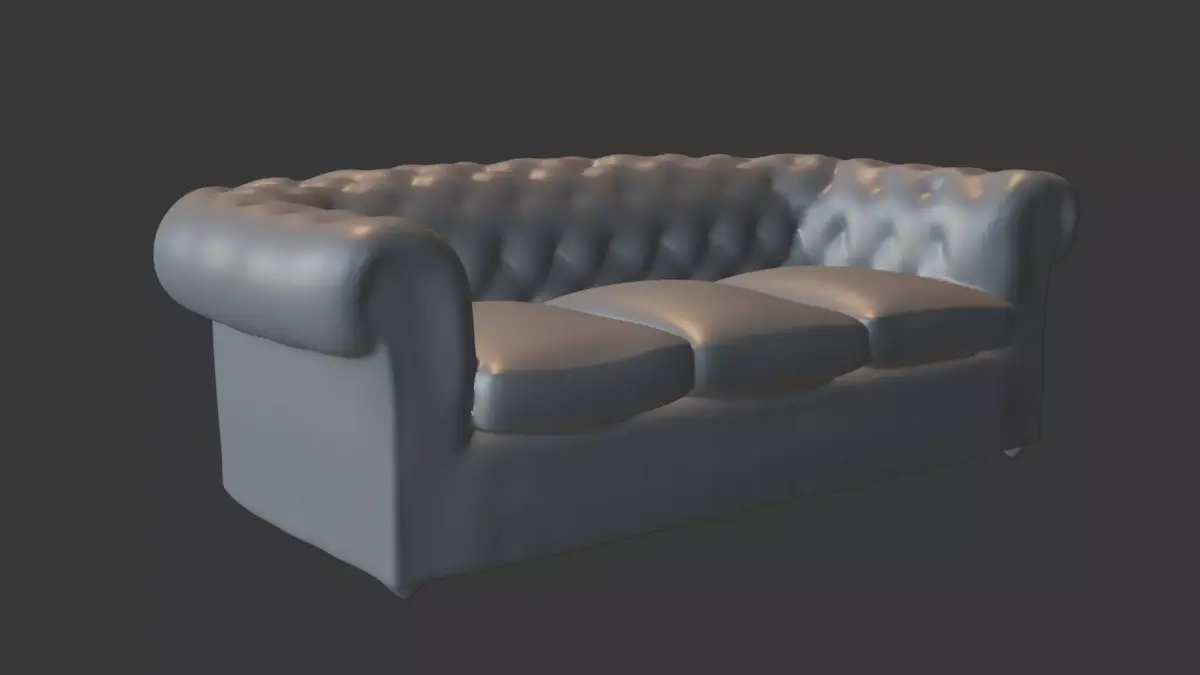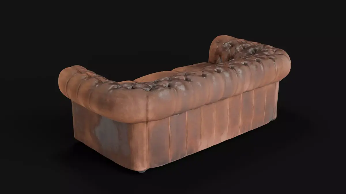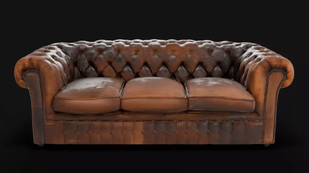 Vintage Leather Couch model. 50K faces, baked from a high-poly 3M faces model. The 50K polycount provides a perfectly smooth silhouette for the deep-button tufting and rolled leather arms, while the professional bakes from a 3-million-poly scan ensure that every cracked leather fold and surface imperfection is captured with surgical precision.