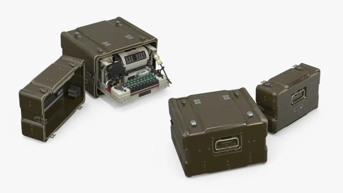 This intricate model showcases a classic coding machine encased in a robust olive drab transport box. Featuring authentic details such as a keyboard with green keys and a complex arrangement of dials and wires, it replicates the mechanical sophistication used in historical military cryptography. The casing protects the delicate components while adding a layer of mobility with its sturdy handles and secure latches.
