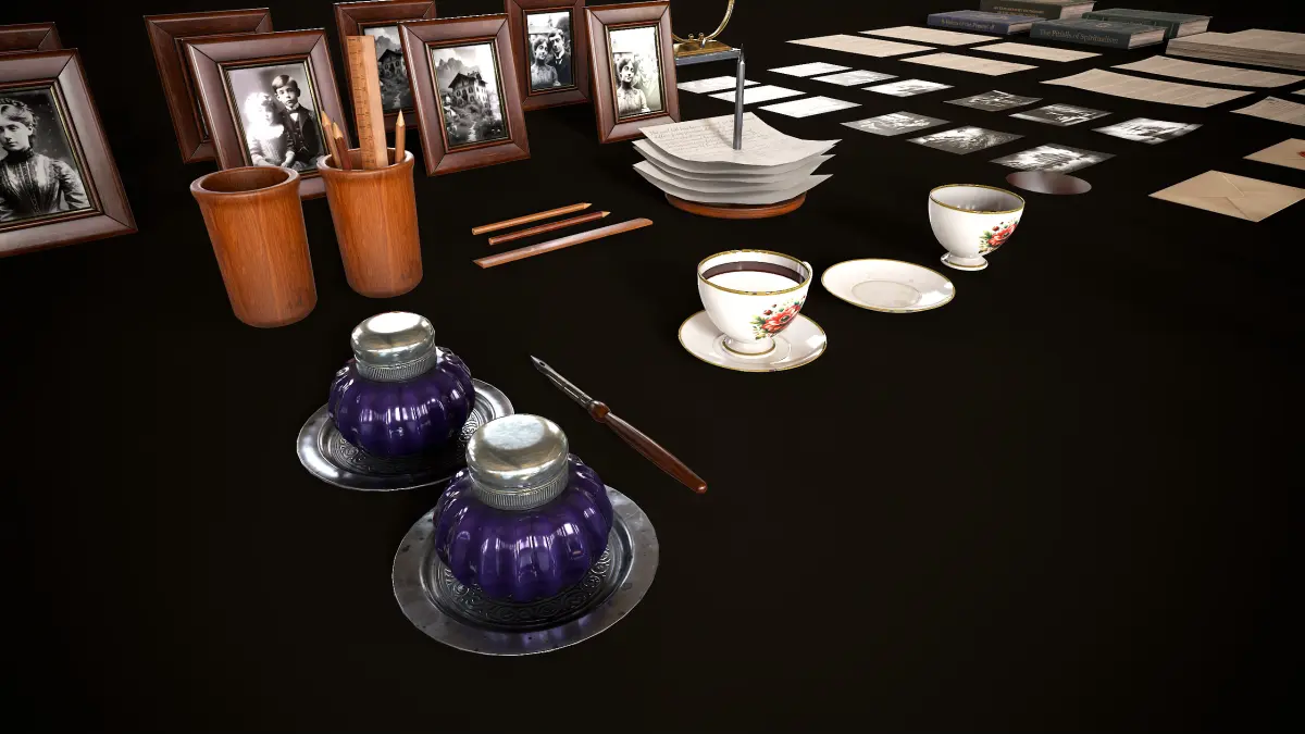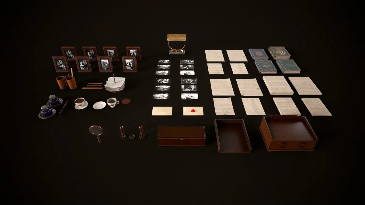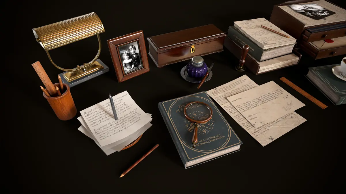 magnifying glass, sealed letters, ink bottle with a quill, antique books, and nostalgic photographs.