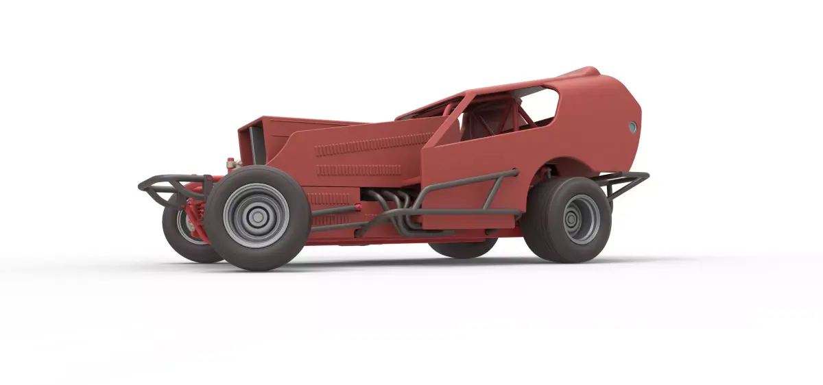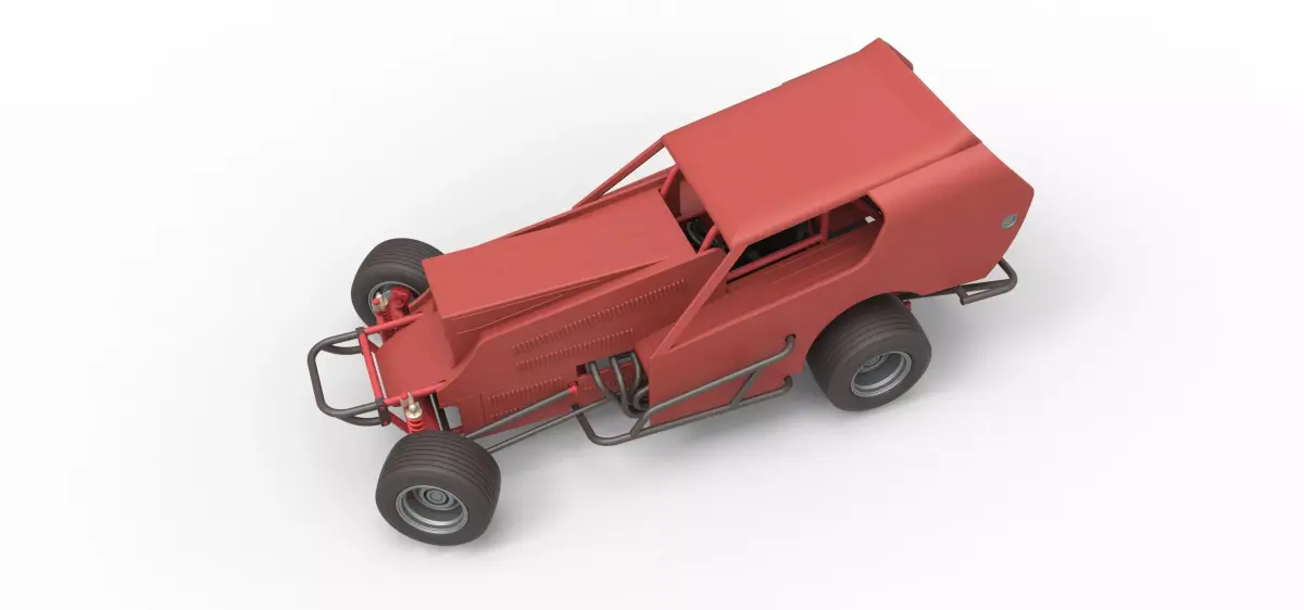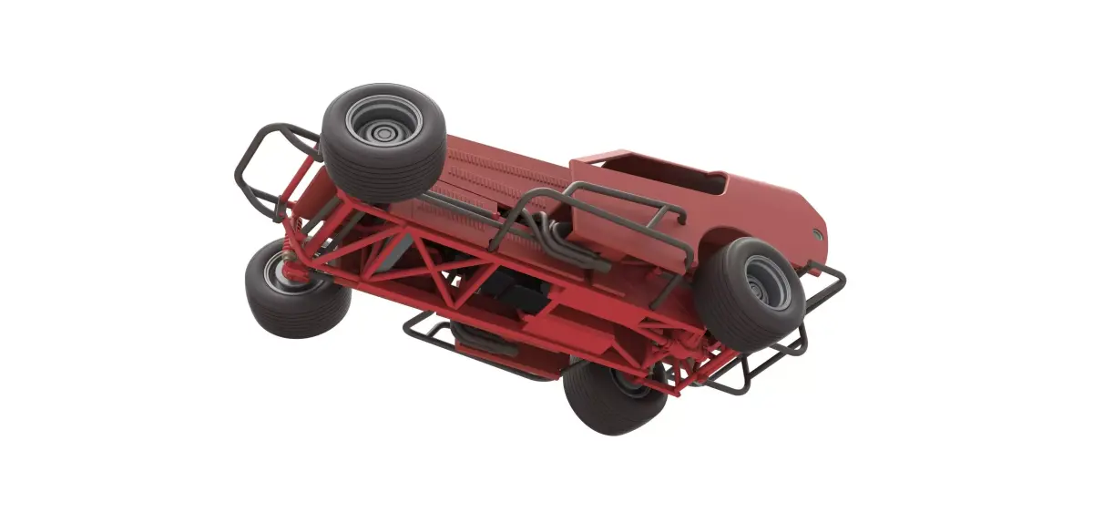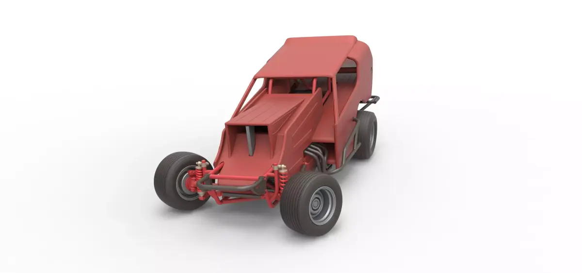 The model consists of parts: Air filter cap, Air filter, Engine, Frame, Front left rim, Front right rim, Front tires, Hood, Left bumper, Left exhaust, Left side shell part, Radiator, Rear left tire, Rear right tire, Rear rim, Right bumper, Right exhaust, Right side shell part, Scoop insert, Seat, Shell main part, Shifter, Steering wheel, Tank.