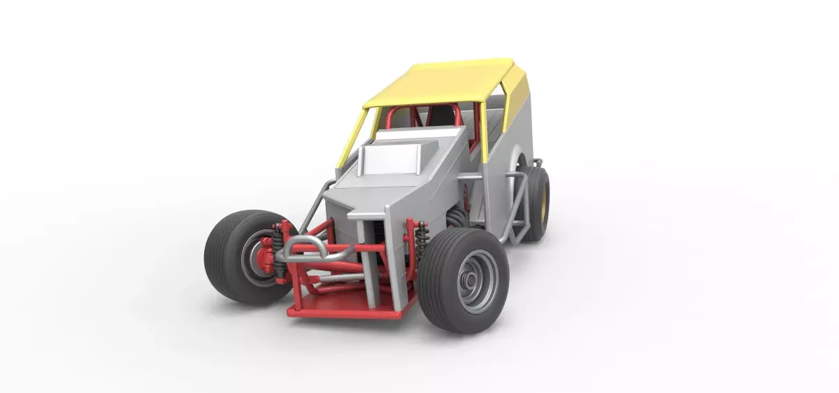 The model consists of parts: Air filter cap, Air filter, Bottom plate, Engine, Frame, Front left rim, Front left tire, Front right rim, Front right tire, Fuel cap, Hood, Left bumper, Left exhaust, Left side plate 1,2, Radiator, Rear bumper, Rear left tire, Rear right tire, Rear rim rings, Rear rims, Right bumper, Right exhaust, Right side plate 1,2, Seat part 1,2, Shell main part, Shifter, Steering wheel, Tank.