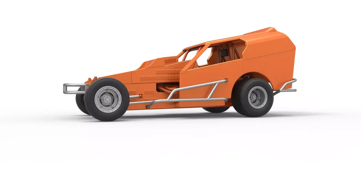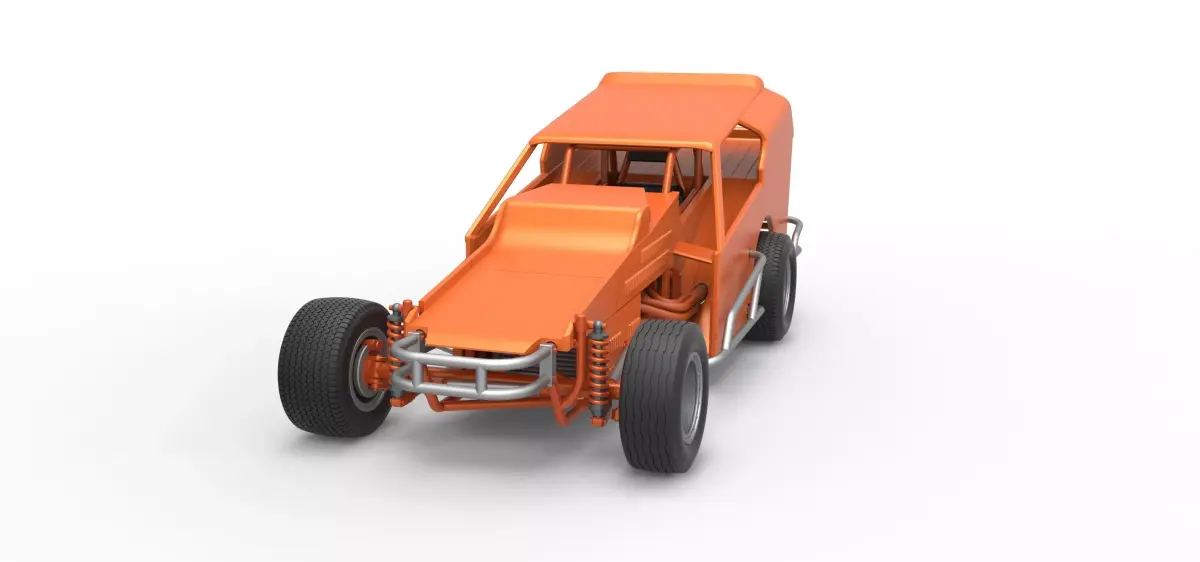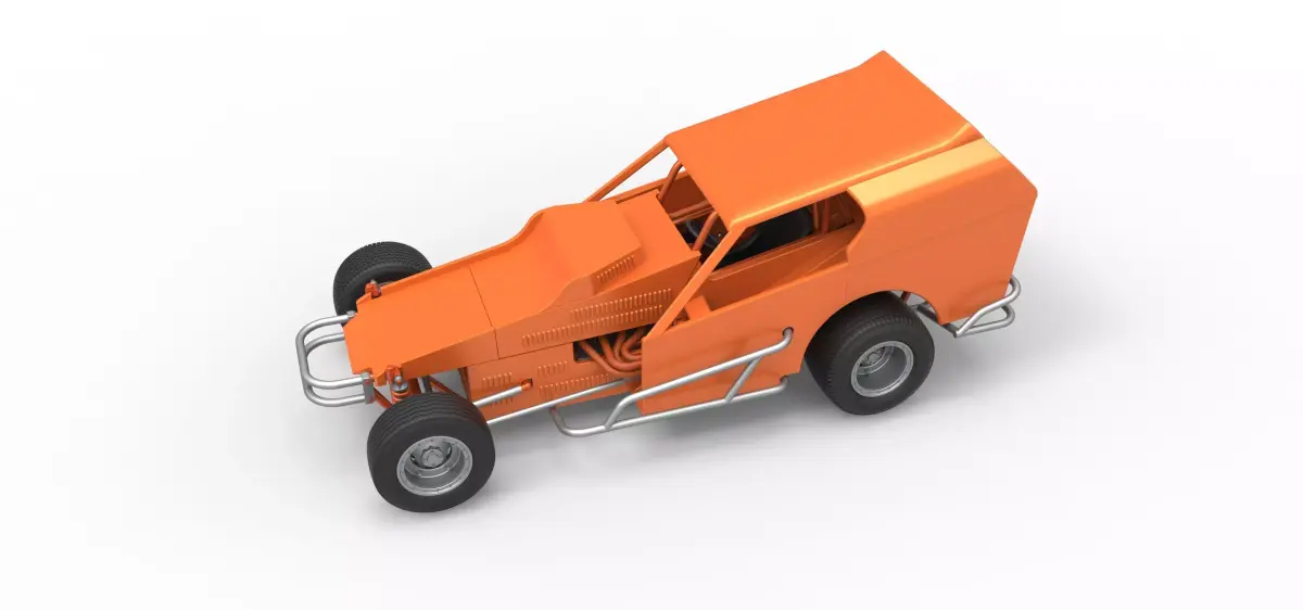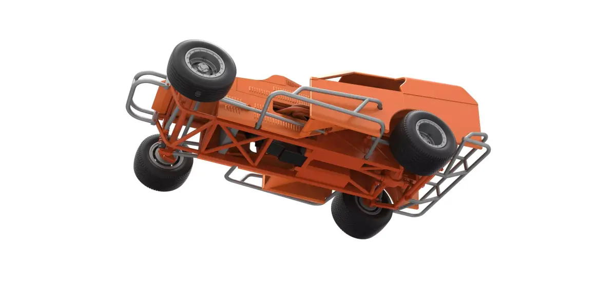 The model consists of parts: Air filter cap, Air filter, Engine, Exhaust pipes, Frame, Front left rim, Front left tire, Front right rim, Front right tire, Fuel cap, Headrest, Hood, Left bumper, Left header, Nose, Radiator, Rear left tire, Rear right tire, Rear rims, Right bumper, Right header, Seat, Shell left part 1,2, Shell main part, Shell right part, Shifter, Steering wheel, Tank.