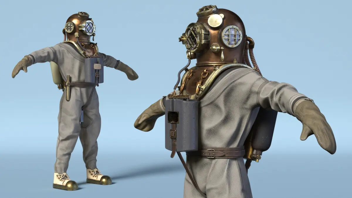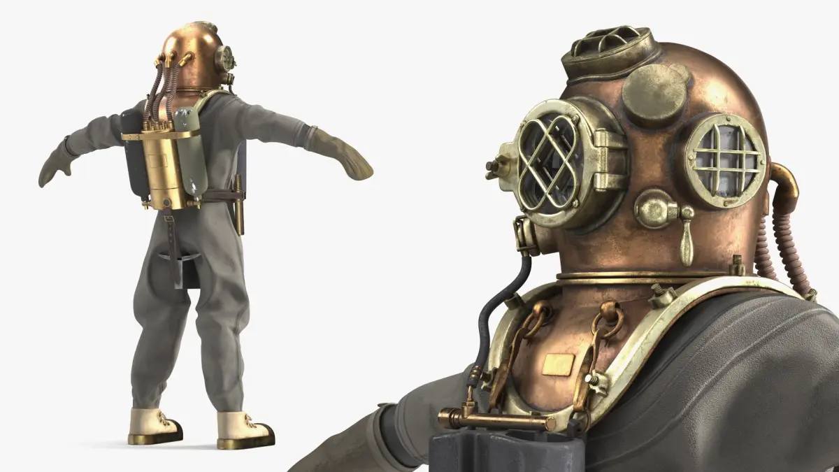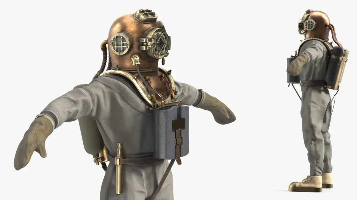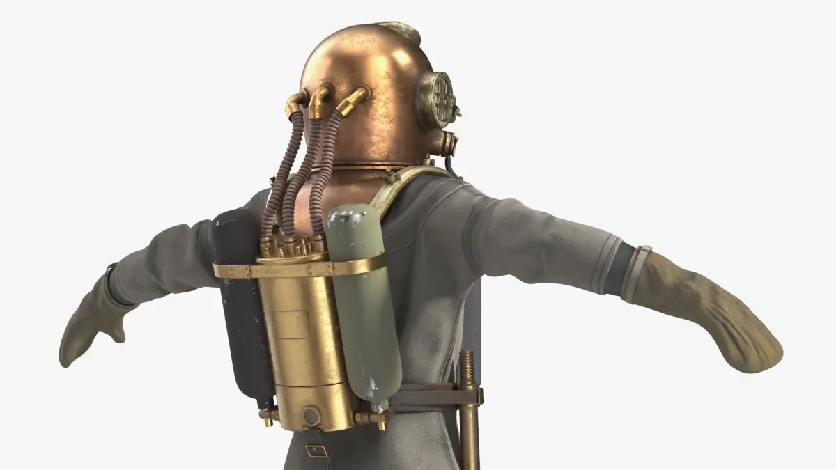 Vintage Diving Dress with Air Tank T Pose Brass is a three-dimensional model of old style, classic deep-sea diving suit, reflecting the iconic design used in underwater exploration in the early 20th century.