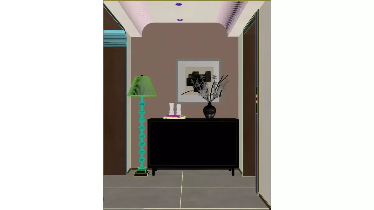 This is an entryway space brimming with mid-century modern charm. The walls are adorned in a gentle blush pink as the primary color, paired with soft, curved ceiling molding, creating a warm and nostalgic atmosphere. At the center sits a black cabinet with wave-patterned detailing, whose textured, undulating surface exudes a strong sense of design. The cabinet top displays vintage sculptural accents and an artistic vase, harmonizing with the overall aesthetic. To the left, a black spiral-shaped floor lamp illuminates the space, while an abstract artwork hanging above elevates the artistic appeal. The concrete grey flooring and dark brown wooden door introduce a striking material contrast, resulting in a sophisticated and understated color palette that seamlessly blends functionality with aesthetic expression, perfectly embodying the fusion of modern and retro home design.