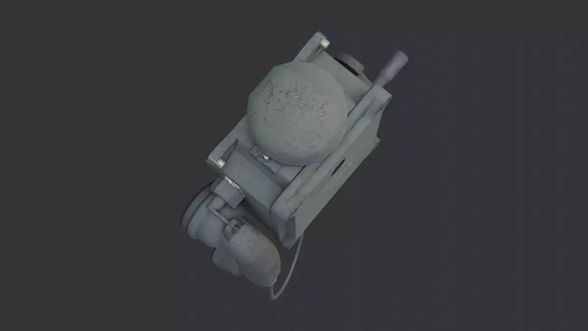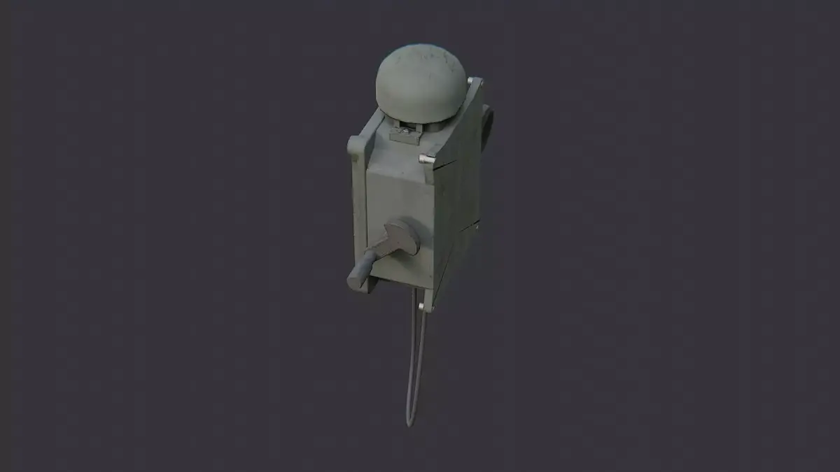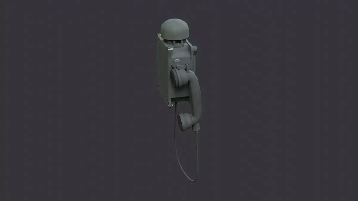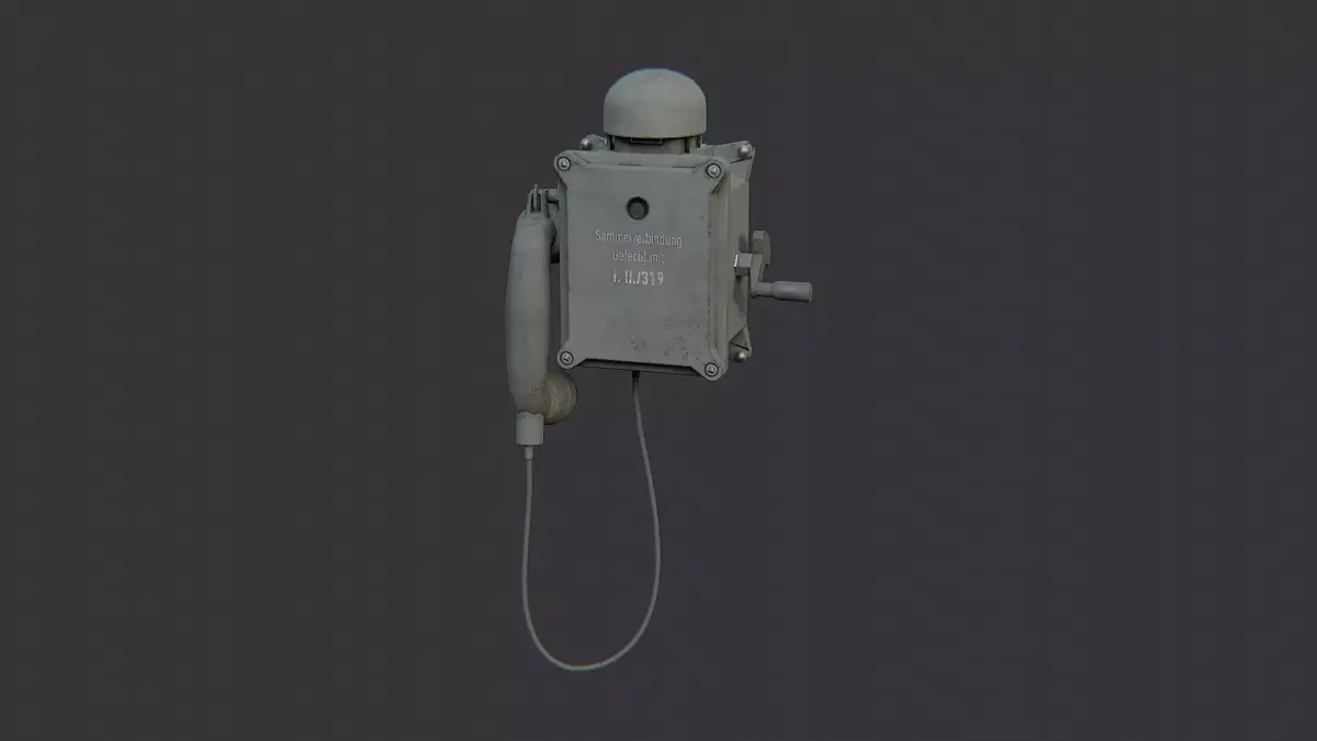 This vintage field phone box uses a rugged metal housing, riveted panels, and a coiled handset cord. The weathered drab finish and authentic screws deliver a believable mid-century comms device. Great as a museum display, film prop, or tabletop sci-fi set dressing needing realistic industrial tech.