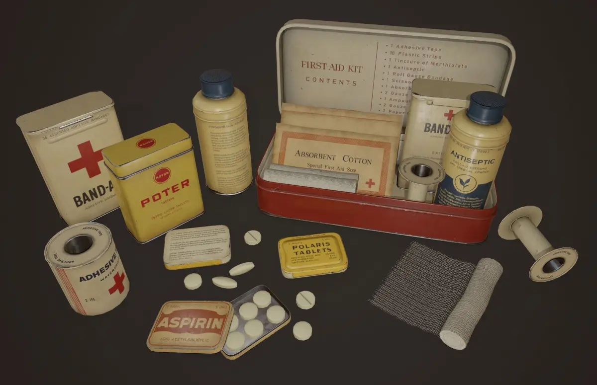 Vintage First Aid Kit it's a lowpoly game ready pack of models with unwrapped UVs and PBR textures.