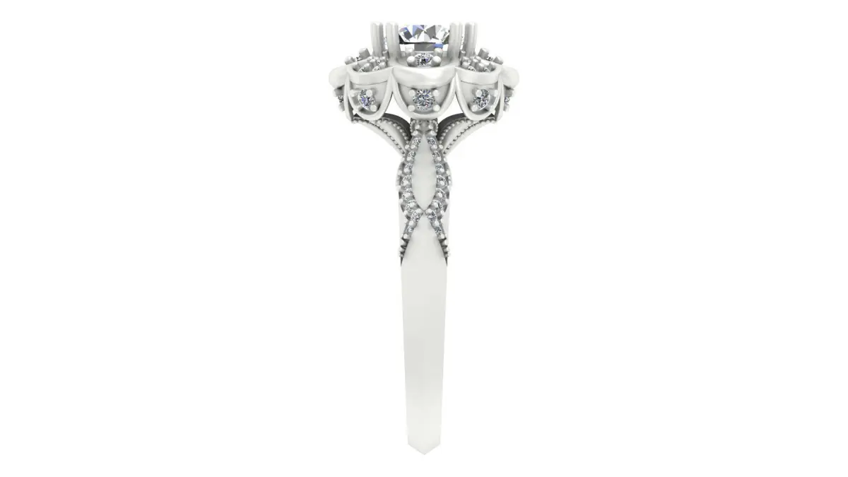 This Vintage Floral Halo Diamond Engagement Ring is a stunning representation of elegance and intricate craftsmanship. Designed with a round brilliant-cut center stone, the piece is surrounded by a unique floral-inspired halo setting, giving it an exquisite and romantic touch. The band is adorned with pavé-set diamonds, and delicate filigree detailing enhances the overall vintage aesthetic.