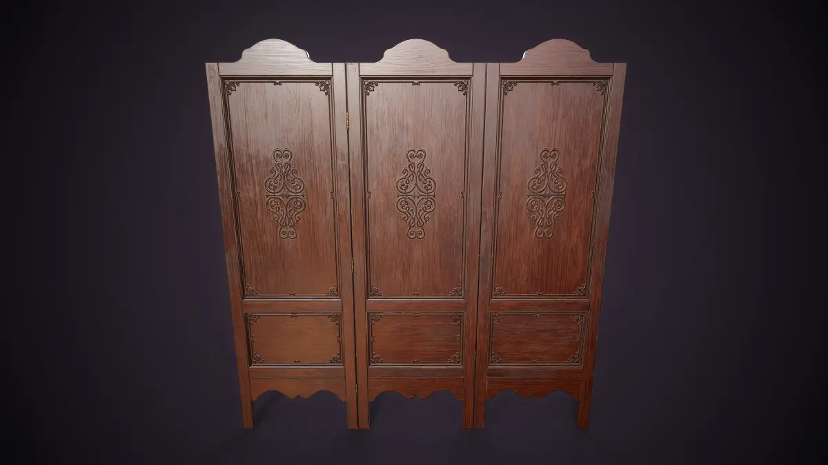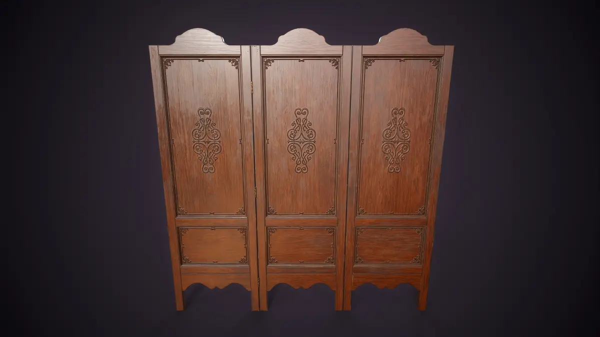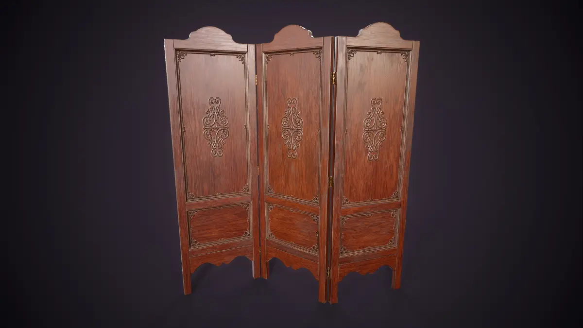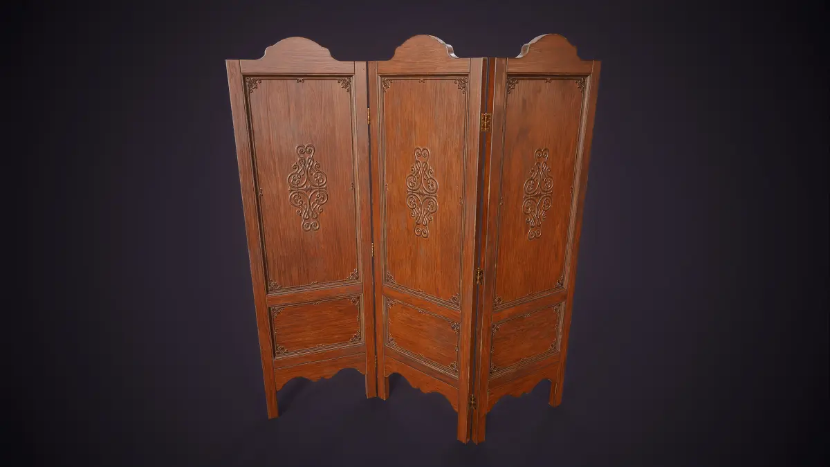 Vintage wooden folding screen. This decorative three-panel screen features intricate carved details,