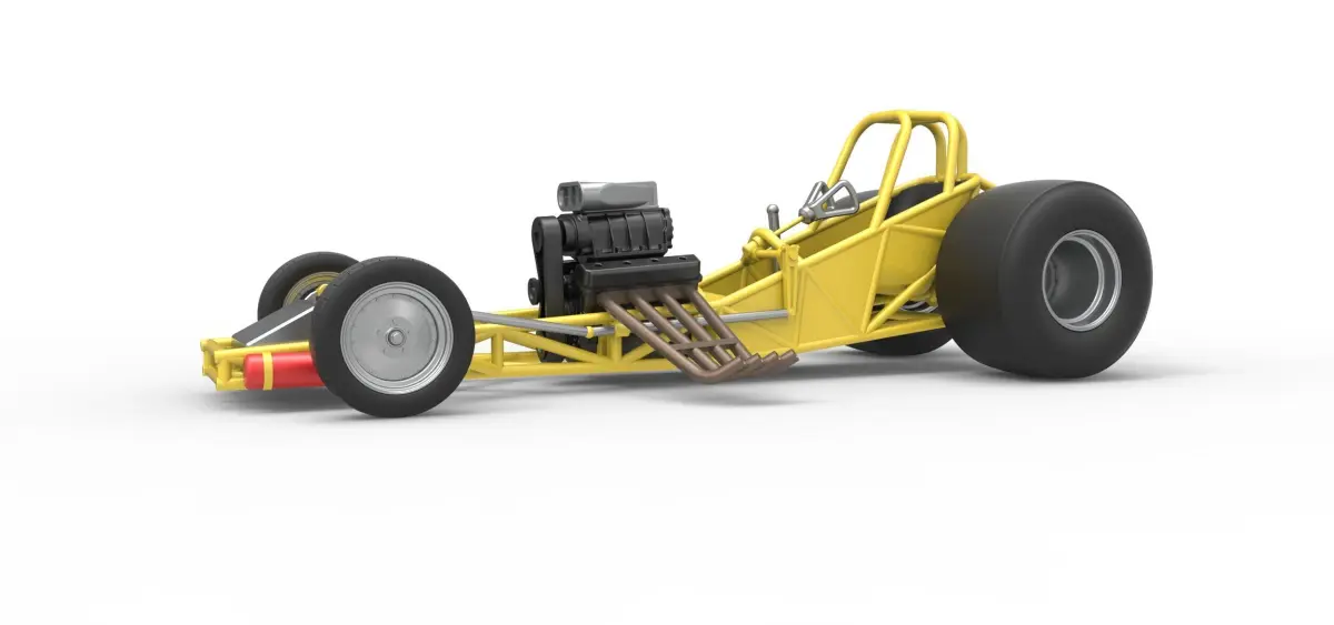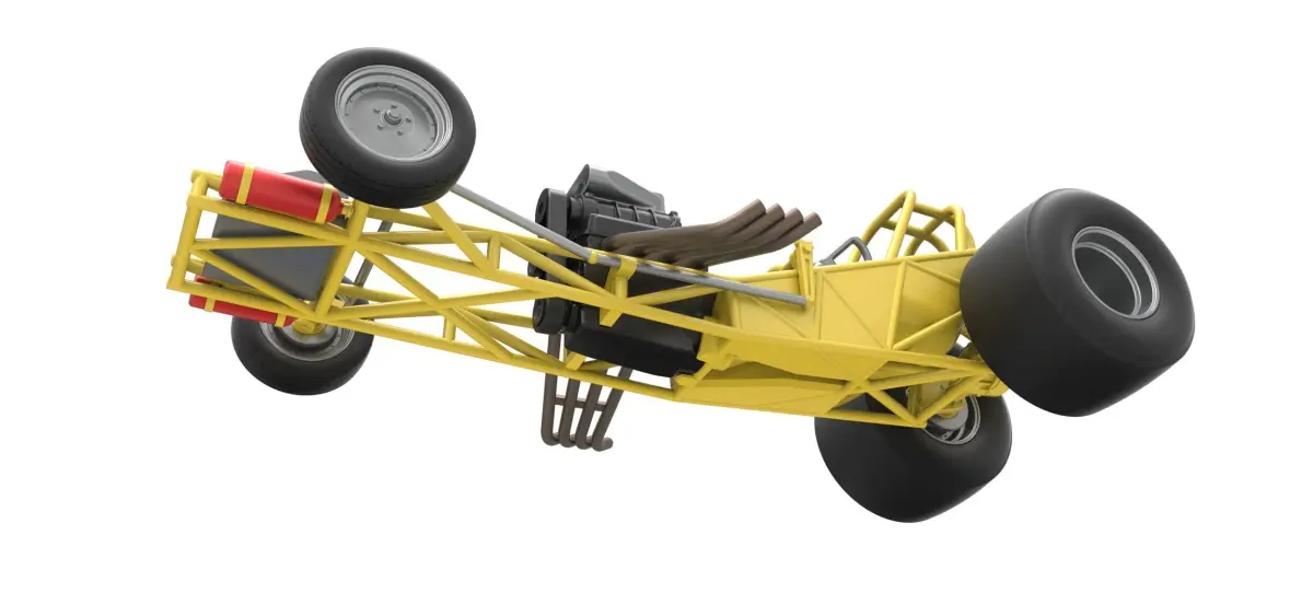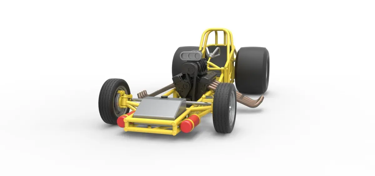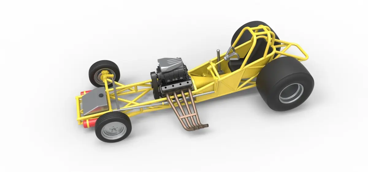 The model consists of parts: Engine, Extinguishers, Frame, Front rims, Front tire, Left exhaust, Rear rims, Rear tires, Right exhaust, Scoop, Shifter, Steering wheel, Tank.