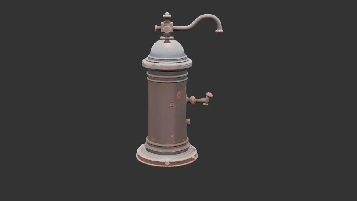 This vintage cast iron water pump is modeled after classic hand-operated pumps seen in rural gardens or farms. The pump features a long curved handle, a spout with mineral buildup, and a round base mounted to a stone slab. The surface includes rust, chipped paint, and wear marks that reflect years of use. Ideal for exterior garden scenes, old farms, or fantasy villages, this prop adds charm and realism to any outdoor setting. It works well in both stylized and photoreal environments and is optimized for easy scene integration.