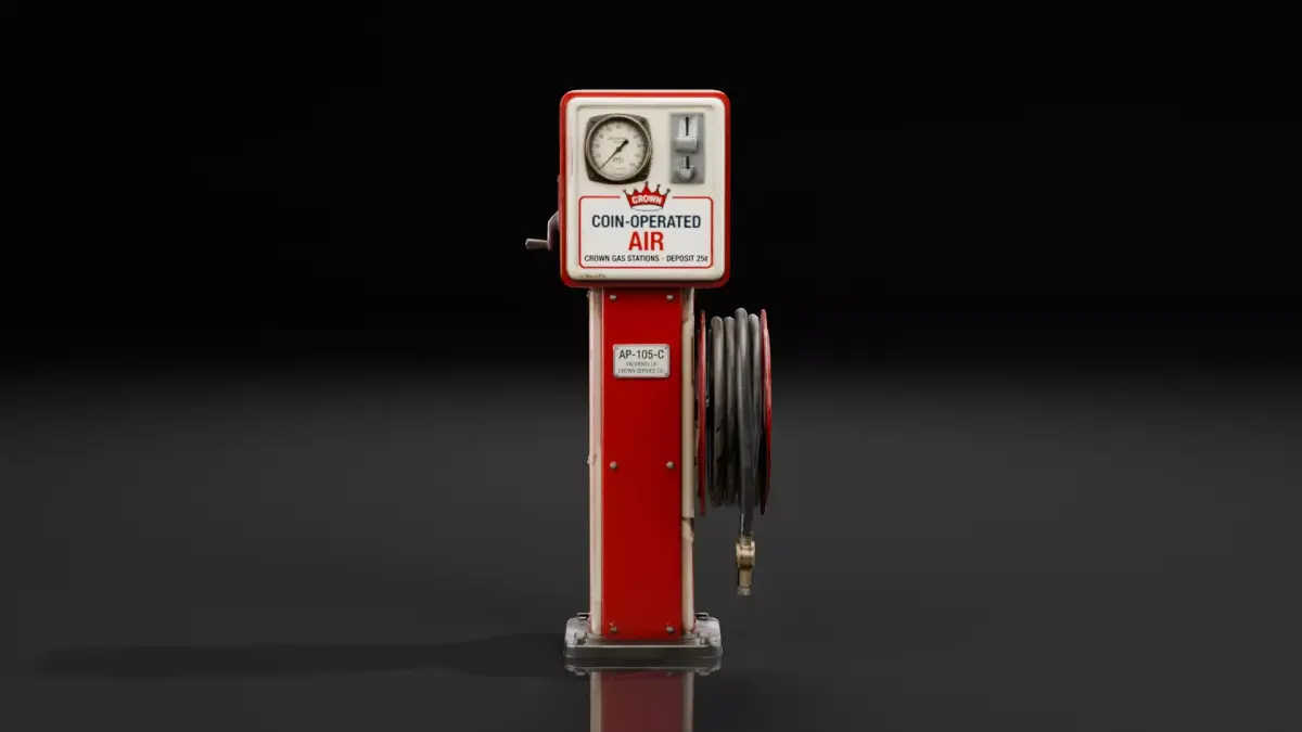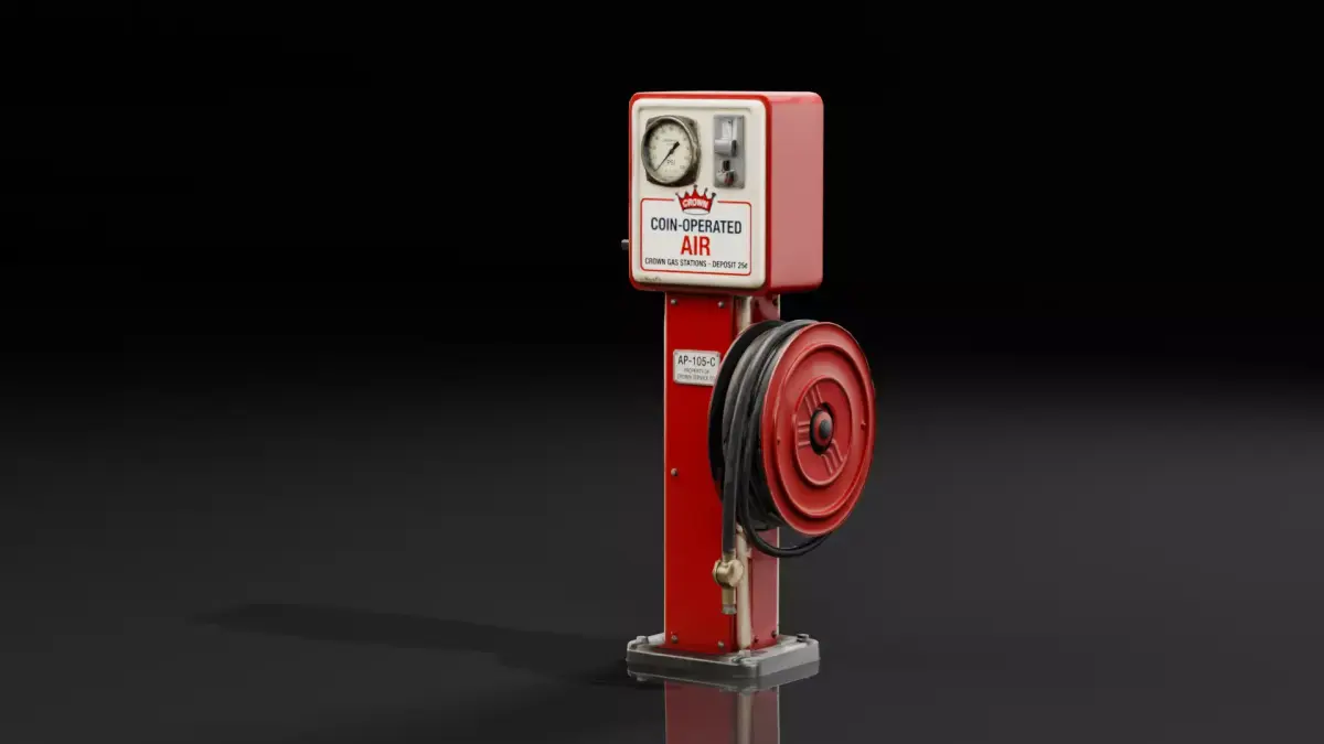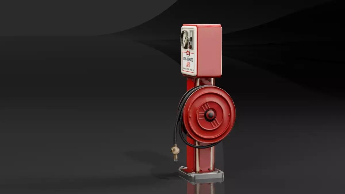 This meticulously detailed prop captures the essence of mid-century roadside Americana. It features a beautifully textured analog PSI pressure gauge, a classic 25-cent coin slot mechanism, a side-mounted hand crank, and a neatly coiled rubber air hose complete with a realistic brass tire nozzle. The painted metal casing shows subtle signs of wear and realism suitable for high-end rendering.