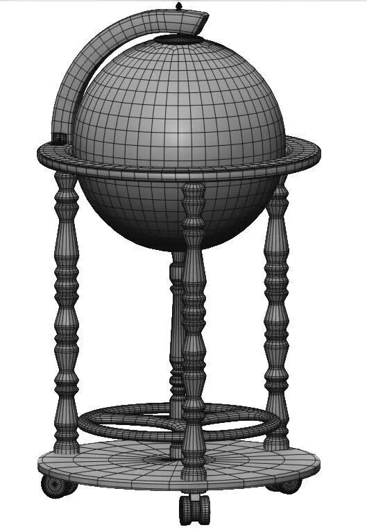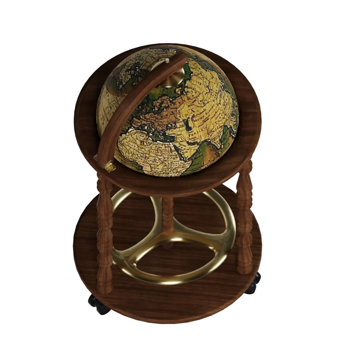 Highly detailed 3D model of a vintage globe bar cart, perfect for interior visualization, product rendering, and design projects. The model features a classic wooden frame with carved legs, a rotating antique-style globe, and functional wheels for mobility. Ideal for luxury, vintage, and home decor scenes. Optimized topology, clean UVs, and PBR materials included.
