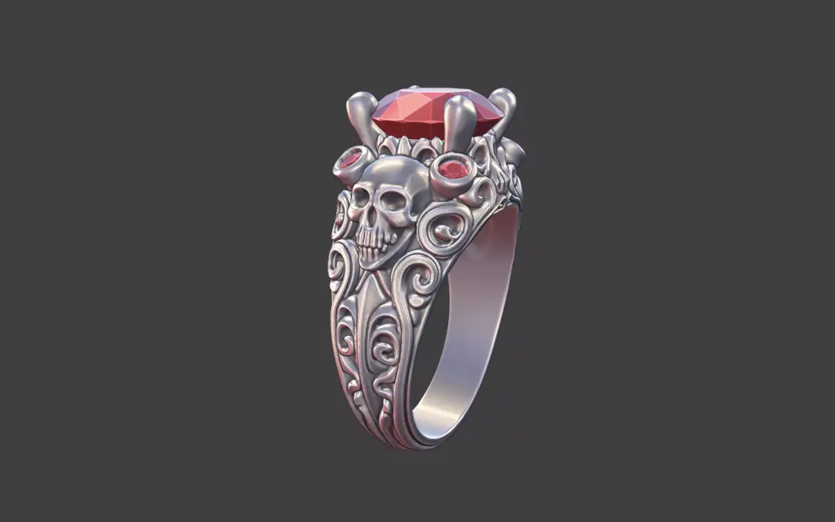 A bold silver ring combining gothic skull artistry with ornate scrollwork engraving along the band. The centerpiece is enhanced a round faceted gemstone, while additional smaller stones are subtly integrated into the surrounding scrollwork for added sparkle and depth. Despite its large visual volume, the ring maintains a compact height, ensuring comfortable wear. Textured surfaces and oxidized recesses give the design richness, ideal for both 3D rendering and silver casting.