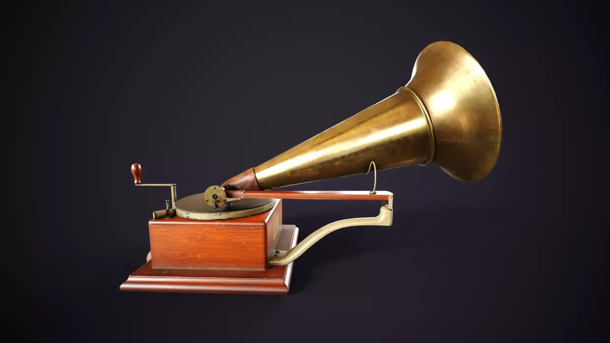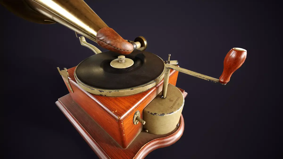 The crank, tone arm, and platter are separate parts allowing for animation.