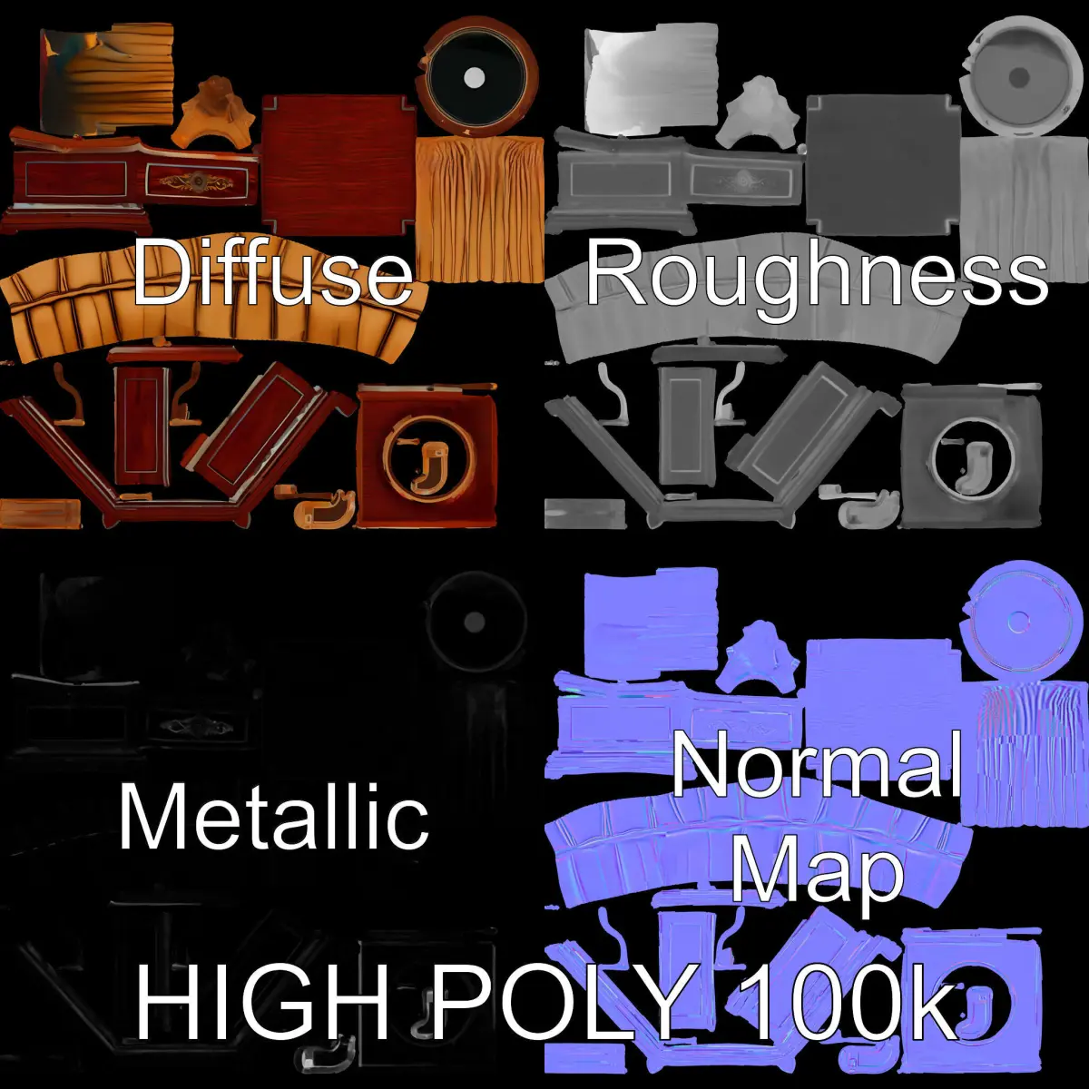 This Vintage Gramophone 3D Model Pack includes models with three levels of detail for versatile use. The gramophone design is carefully crafted to provide a realistic and detailed representation suitable for both interactive and production purposes. Ideal for historical scenes, vintage-themed games, and educational presentations, this model offers a classic touch. PBR textures enhance realism, and the model comes with Diffuse, NormalMap, and Reflection/Roughness/Metallic maps, making it compatible with modern rendering engines like 3ds max, Maya, and game engines such as Unity and Unreal. The model boasts accurately unwrapped UVs with no overlaps, and all textures are 4096x4096 in size. The first image is the reference used for creating the 3D model. It is important to carefully evaluate the quality of the model by examining the preview images that display the topology and polygonal mesh. These previews (WIRE and WEB 3D Preview) clearly demonstrate how accurately the model matches the original reference and how well the geometry has been executed. If you enjoy the model, please like and leave a comment.