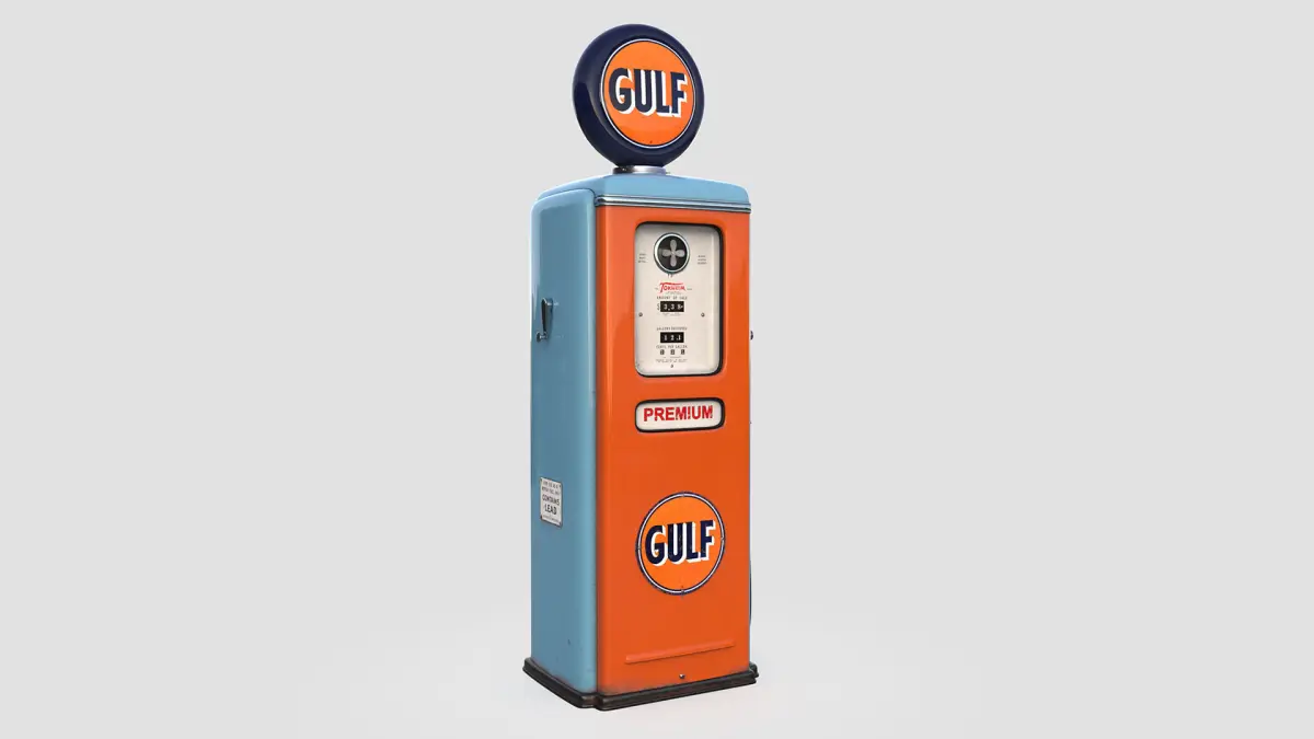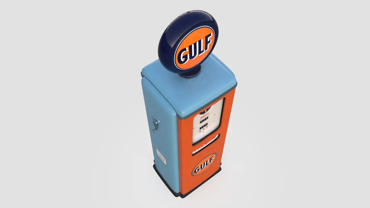 High quality Gulf Gasoline Pump model.Manufacturer: Tokheim.Model: T39 Year: 1948Modeled in Maya 2018.All textures with 4096x4096.Real-world scale.Main Maps (Vray): Base Color, Glossiness, ior, Normal map, Opacity and Refection.Extras Maps(PBR): Roughness, Metalness and Occlusion.