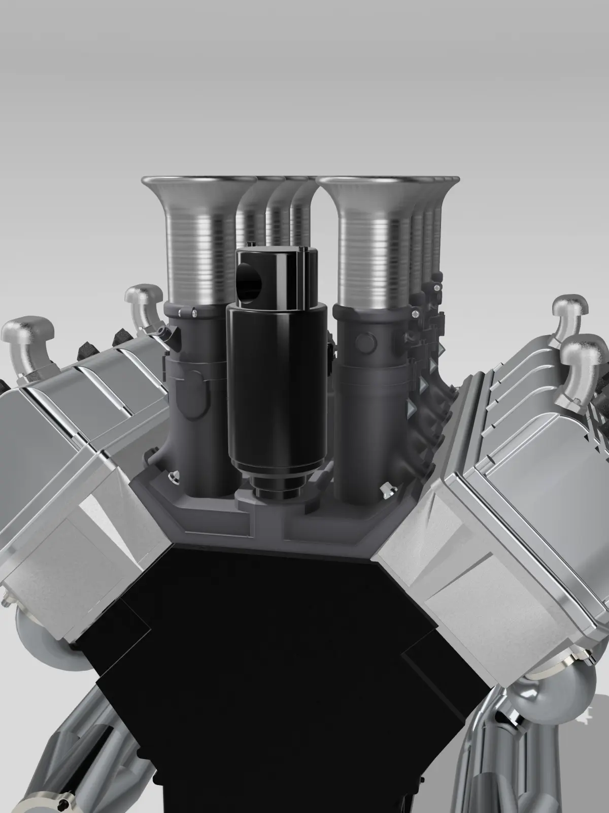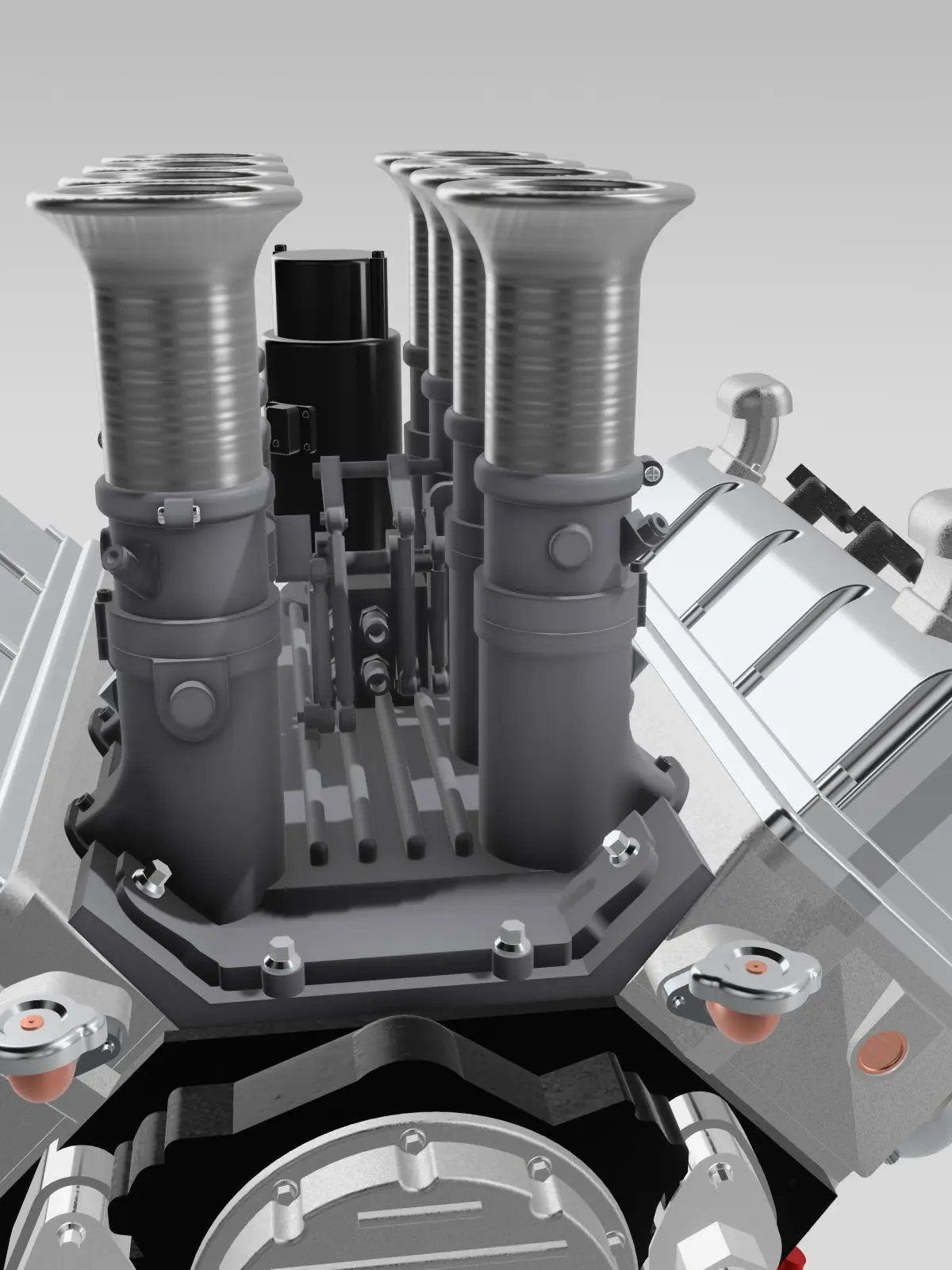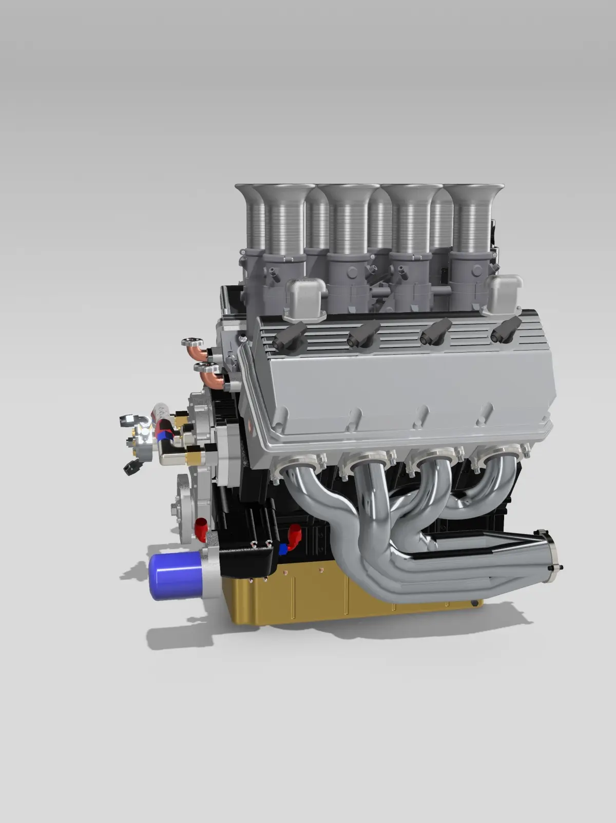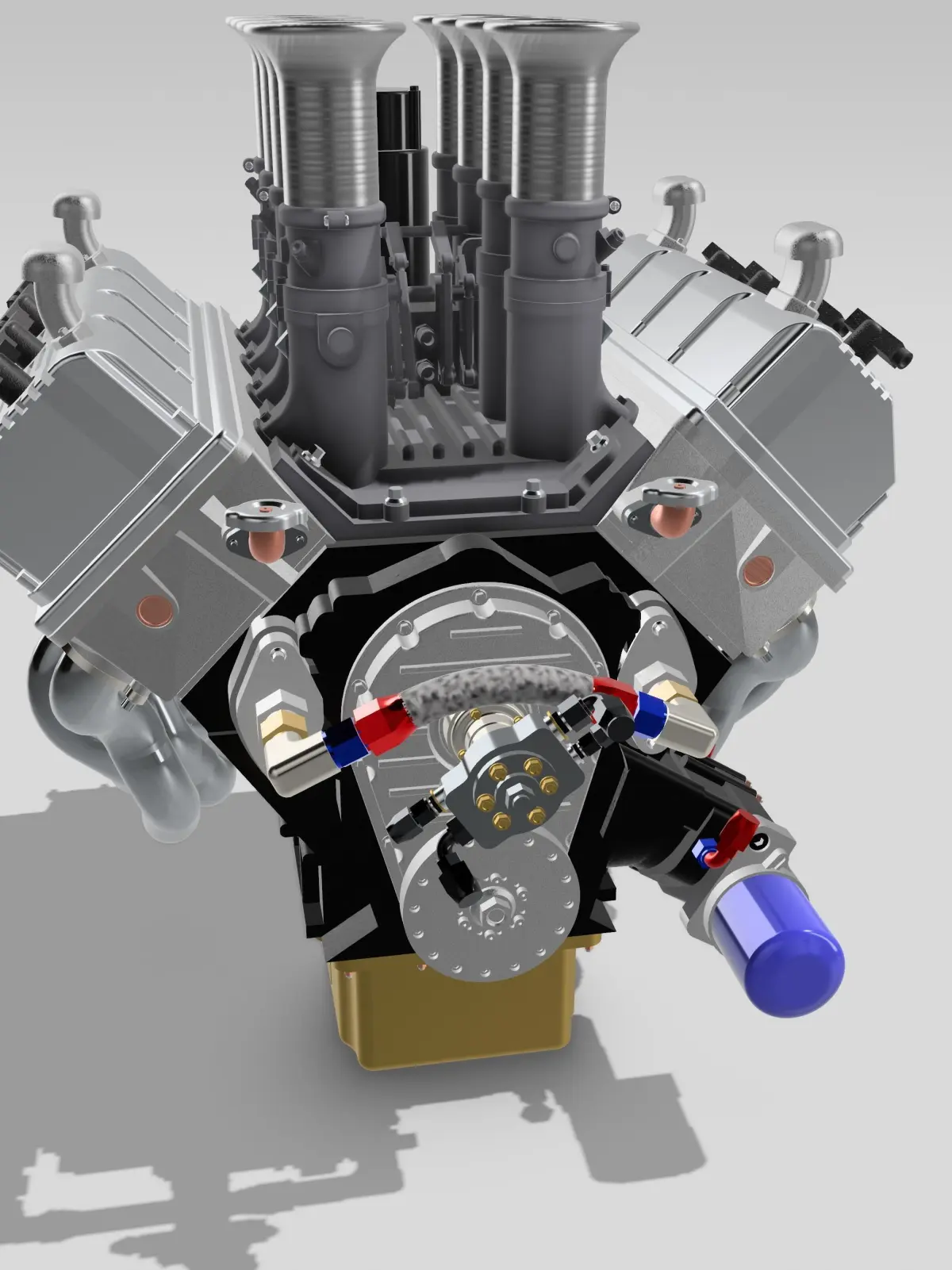 Designed from scratch is a vintage 1960s/1970s style drag racing Hemi engine in a Hilborn mechanical injection version, high in detail, ideal for scale modeling (currently in 1/24 and 1/25 scale).