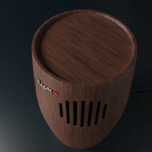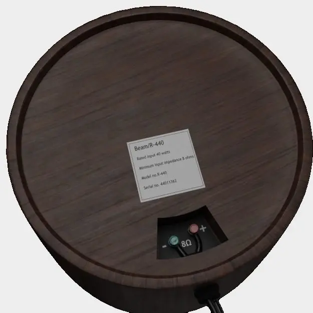 The Beam R-440 hi-fi Domestic Loud Speaker cabinet is made of a chocolate brown to dark brown teak. The speaker dimensions are height 700 mm, radius of 220 mm at it's widest in the middle. It tapers off at both the top and bottom to a radius of 185 mm. The cushion is made of poly plastic and is approximately 50 mm thick.The Beam Logo is not a registered trade mark so it may be edited out. It was modelled using Blender 2.91. Rendered with Cycles X. Texture files are PBR metallic/ Roughness workflow with Diffuse/ Base Color, Roughness, Metallic and Normal maps. the map sizes are 512 x 512 and 2048 x 2048.