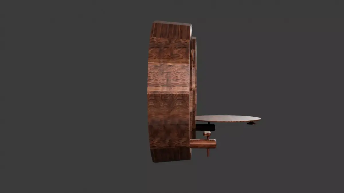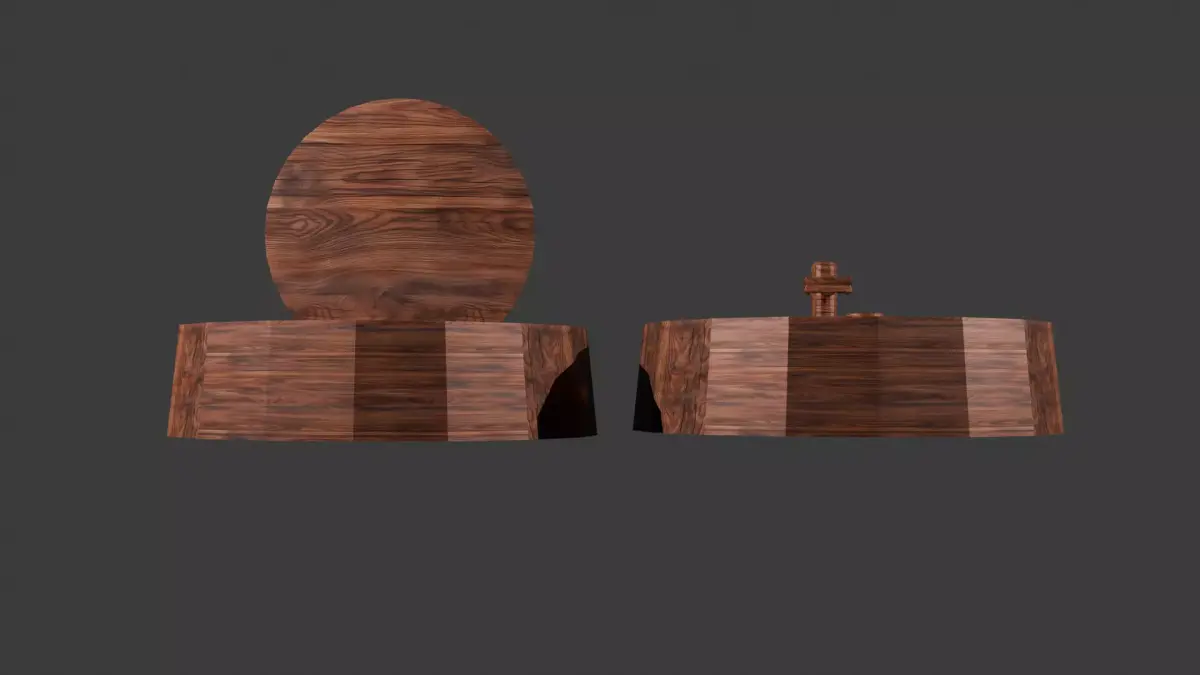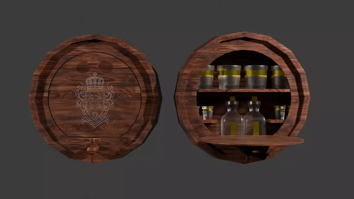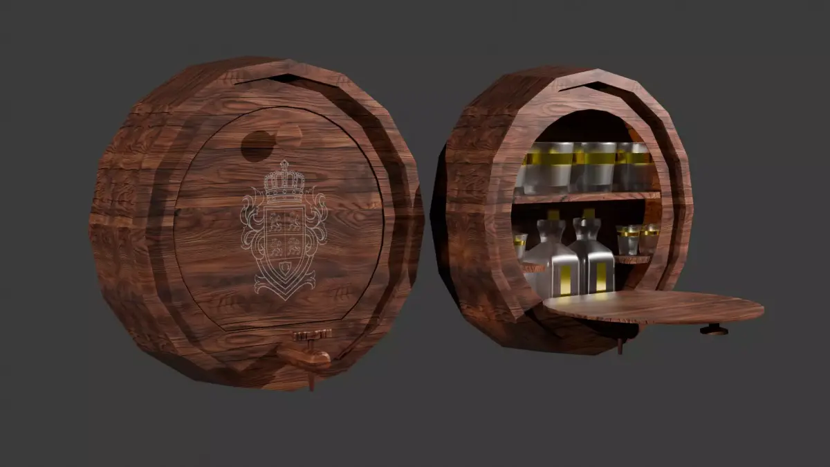 This vintage keg-shaped wall bar combines rustic charm with practical design. Modeled with sixteen sides for a smooth barrel-like form, it mounts directly to the wall and features a front door that opens downward to reveal a neatly arranged interior. Inside, glassware and decanters are displayed, creating a classic home bar aesthetic reminiscent of old pub decor. The exterior includes a faux wooden spigot for added authenticity and handcrafted detailing. The model comes in two versions: a fully detailed version with visible glassware, and a closed, low-poly alternative for optimized performance in real-time or game environments. Perfect for vintage, rustic, or industrial-themed interiors, this piece blends craftsmanship and functionality in a striking wall-mounted design.