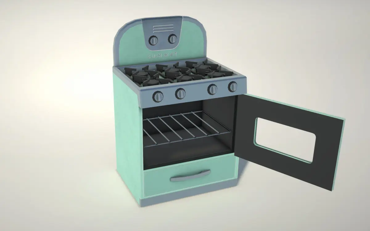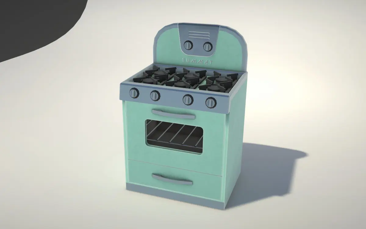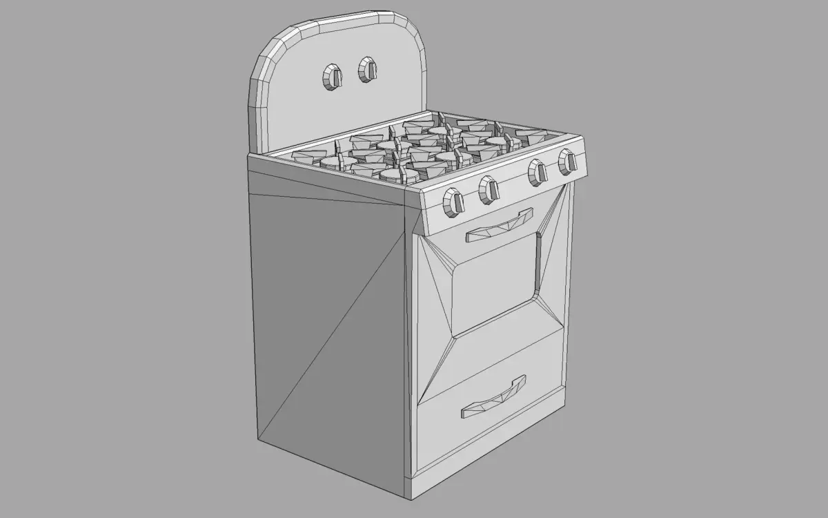 A vintage kitchen stove, around mid century. This asset is game ready, uses as few polygons and vertices where possible, omitting polygons when not seen e.g back and base of unit.