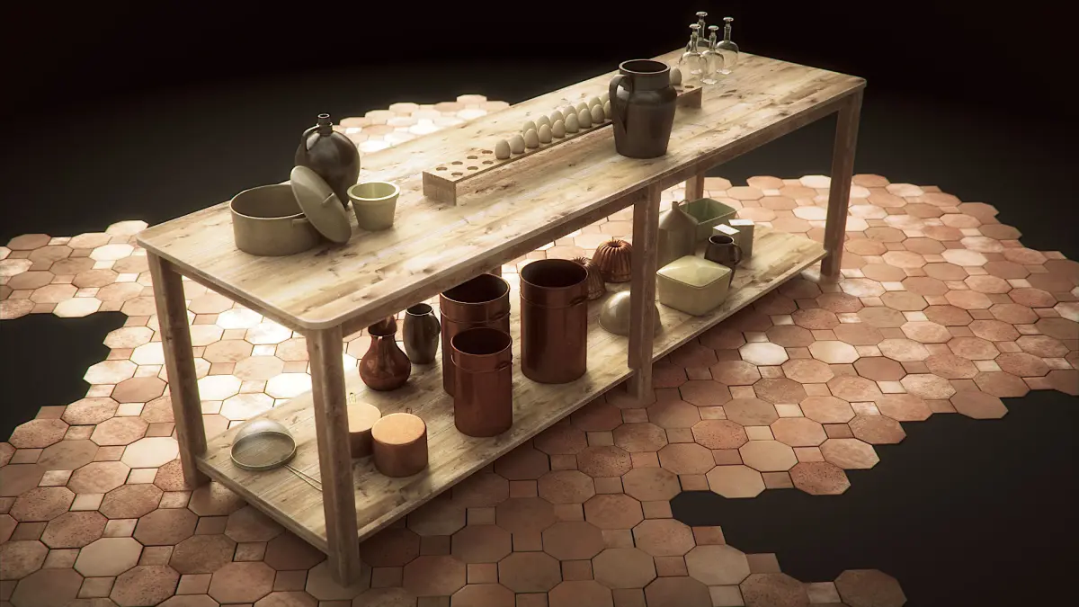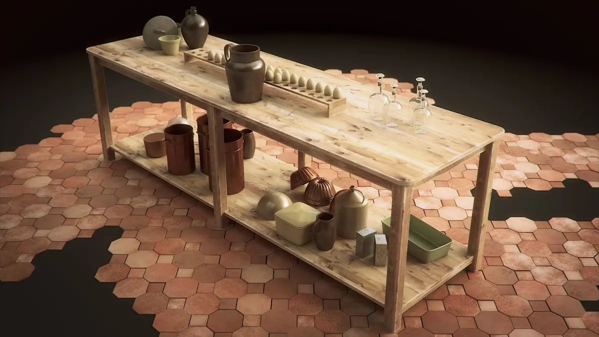 This vintage wooden kitchen shelf and vintage wooden kitchen table are high quality models that will enhance detail and realism of any of your rendering projects. The table, the floor and all other elements have a fully textured, detailed design that allows for close-up renders.